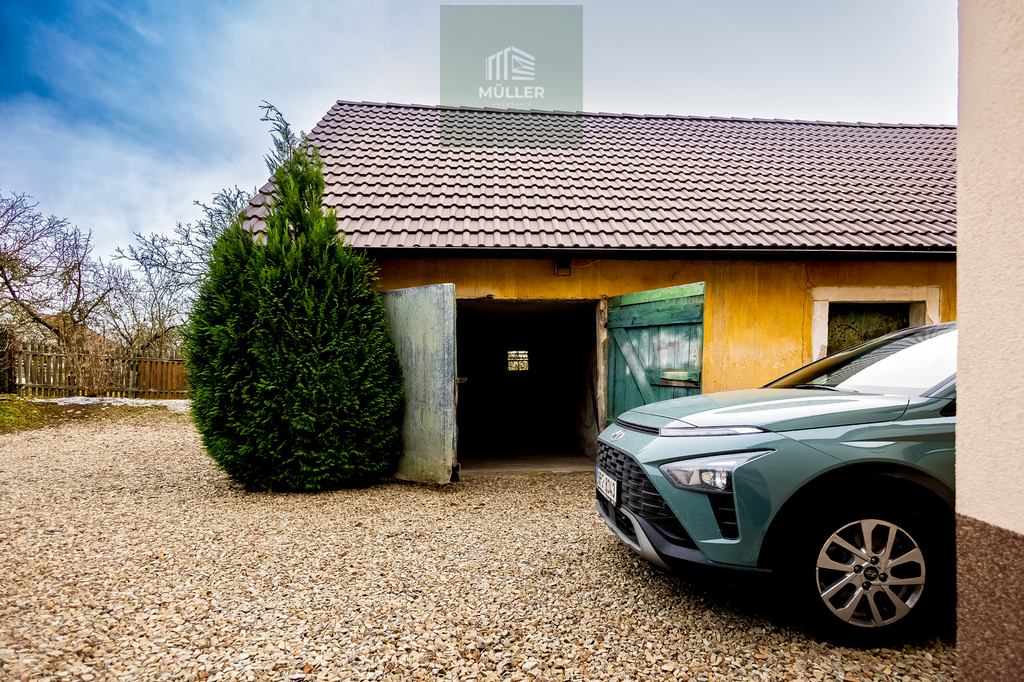 BUDOVA Č. 1 – Stodola / dům s garáží (oddělitelná část) Lze ji oddělit a užívat nebo prodat jako samostatnou jednotku s vlastním přístupem. Přízemí: garáž + cca 49 m² dílna/stodola, první patro připravené k budoucí vestavbě. Nová střecha (tašková krytina) smíšená konstrukce, omítky nejsou dokončené budova nemá evidenční číslo.