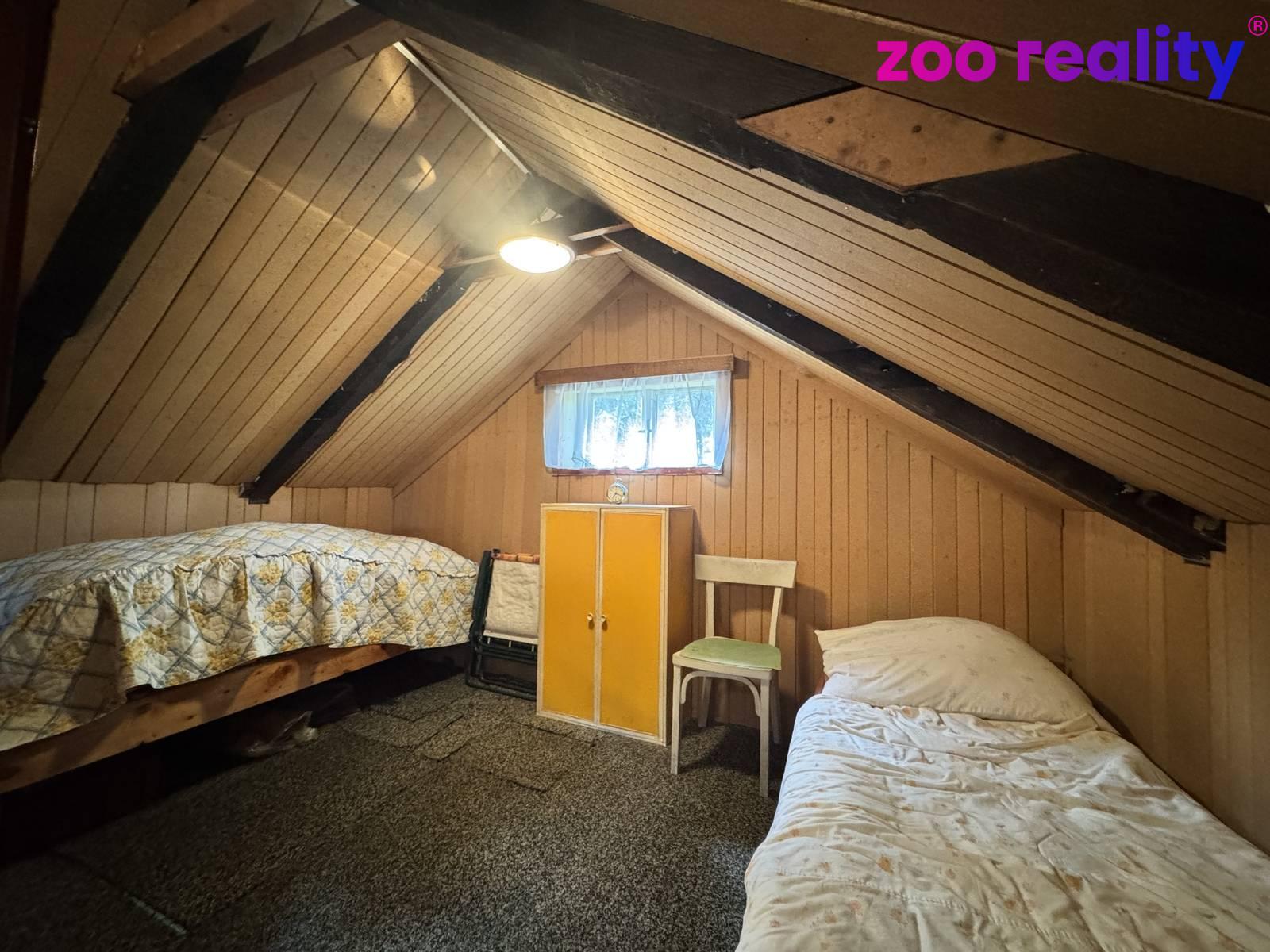 Vstupními dveřmi vejdeme do chaty a stojíme na verandě, ze které vedou dveře do koupelny s toaletou a do obytné části - kuchyně a pokoje a dále schody vystoupáme do obytného podkroví, které poskytuje dostatek prostoru pro spaní ve Vašem budoucím víkendovém útočišti. Užitná plocha nemovitosti činí 88 m², což zajišťuje pohodlné a příjemné užívání chaty. Topení je řešeno kamny na tuhá paliva, teplou vodu zajišťuje elektrický bojler.