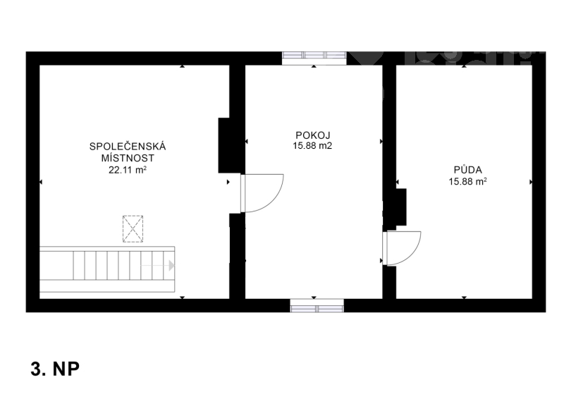 Podkroví: Společenská místnost, pokoj po rekonstrukci a úložné prostory v podstřeší.