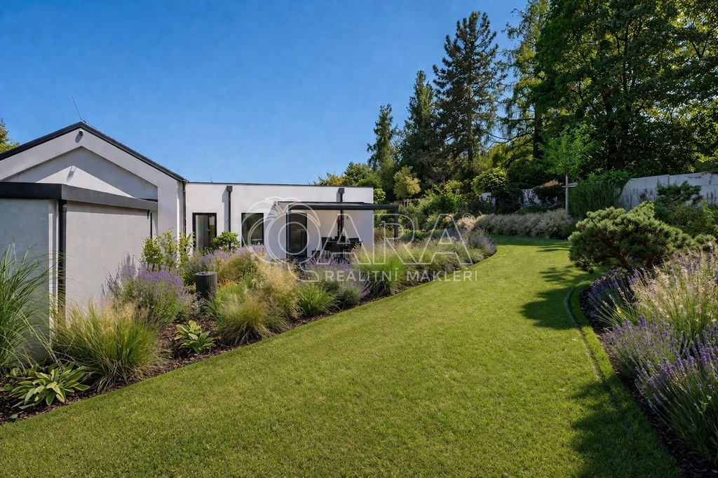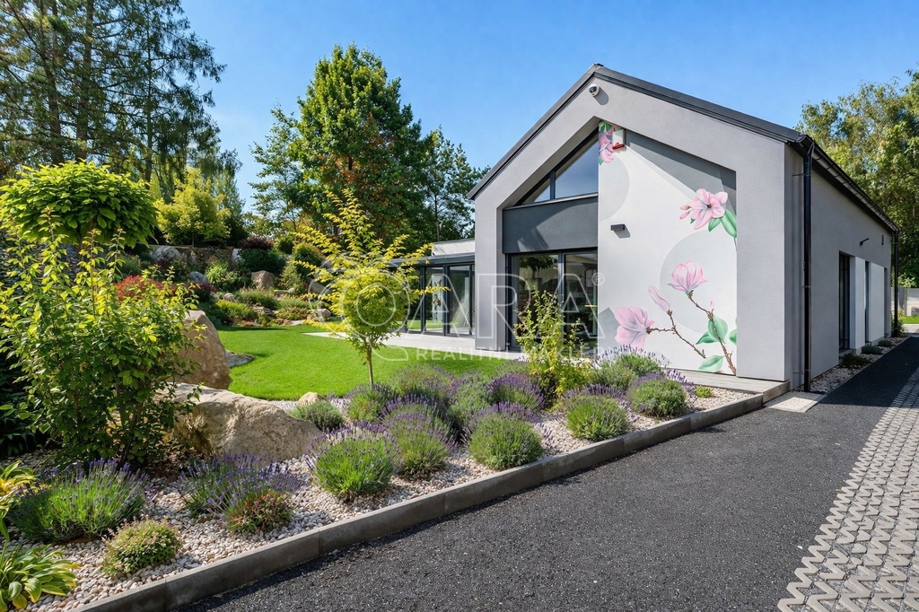 Zprostředkujeme Vám ke koupi moderní, reprezentativní, designový, maximálně funkční vilový bungalov (dřevostavba) s obytnou plochou 145 m2, se zimní a architektonickou zahradou, situovaný v nejprestižnější části Kamenice – Štiřín, v klidové zóně u zámku a golfového hřiště. Tento výjimečný dům je vystavěn na pozemku o celkové ploše 1 205 m2 a byl kolaudován v roce 2023. Dominantou stavby je originální ručně malovaná fasáda od akademického malíře, která domu dodává naprosto jedinečný charakter a činí jej skutečným designovým originálem. Parcela je bez přímých sousedů, vzrostlé stromy vytvářejí přirozené soukromí i mikroklima – ráno vás probudí ticho a zeleň, večer si užíváte jemně nasvícenou zahradu místo pohledů do cizích oken.