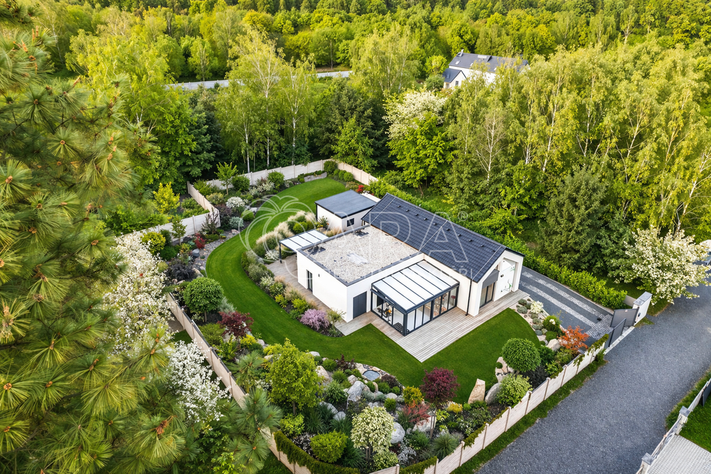 Vodní kaskáda, LED osvětlení, bonsaje a solitérní stromy, terasy, automatická závlaha, profesionální modelace terénu a výsadba zajišťující absolutní soukromí. Celek působí jako soukromý resort.
