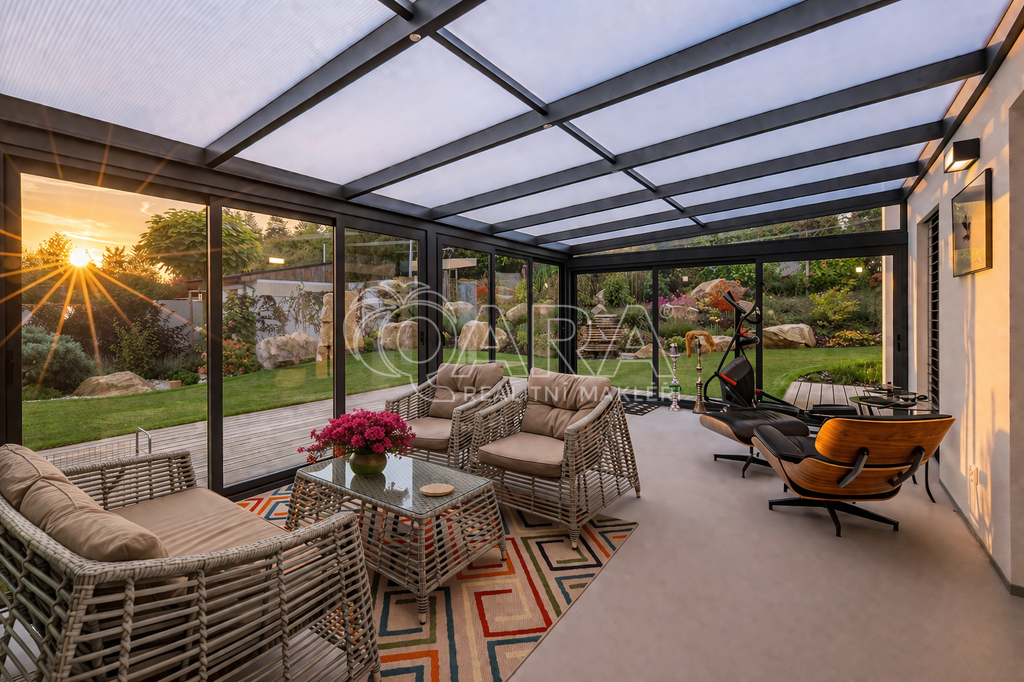 Celoroční využití (jídelna / relaxační zóna), podlahové vytápění, přímý vstup na zahradu, dálkově ovládané stínění ISOTRA