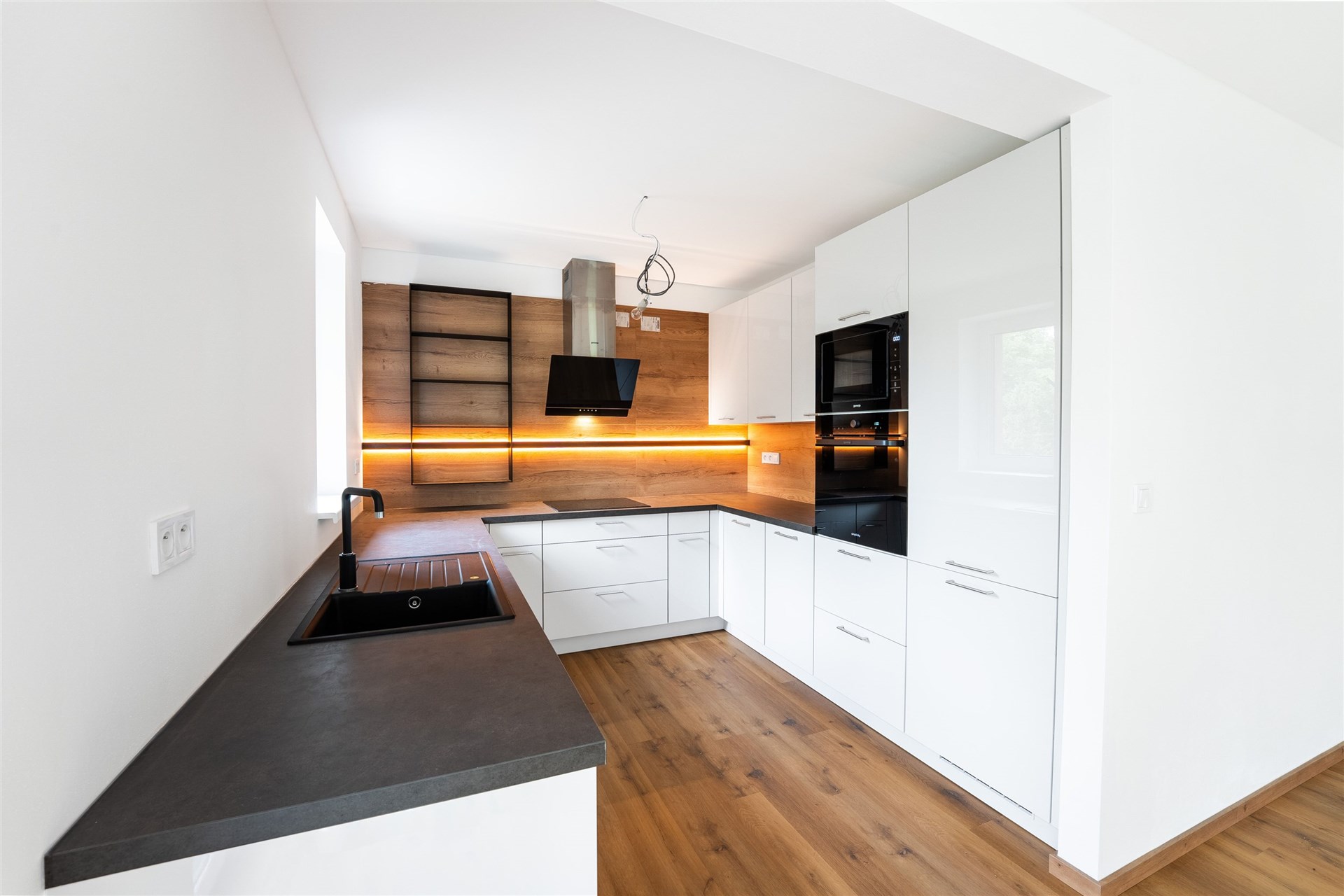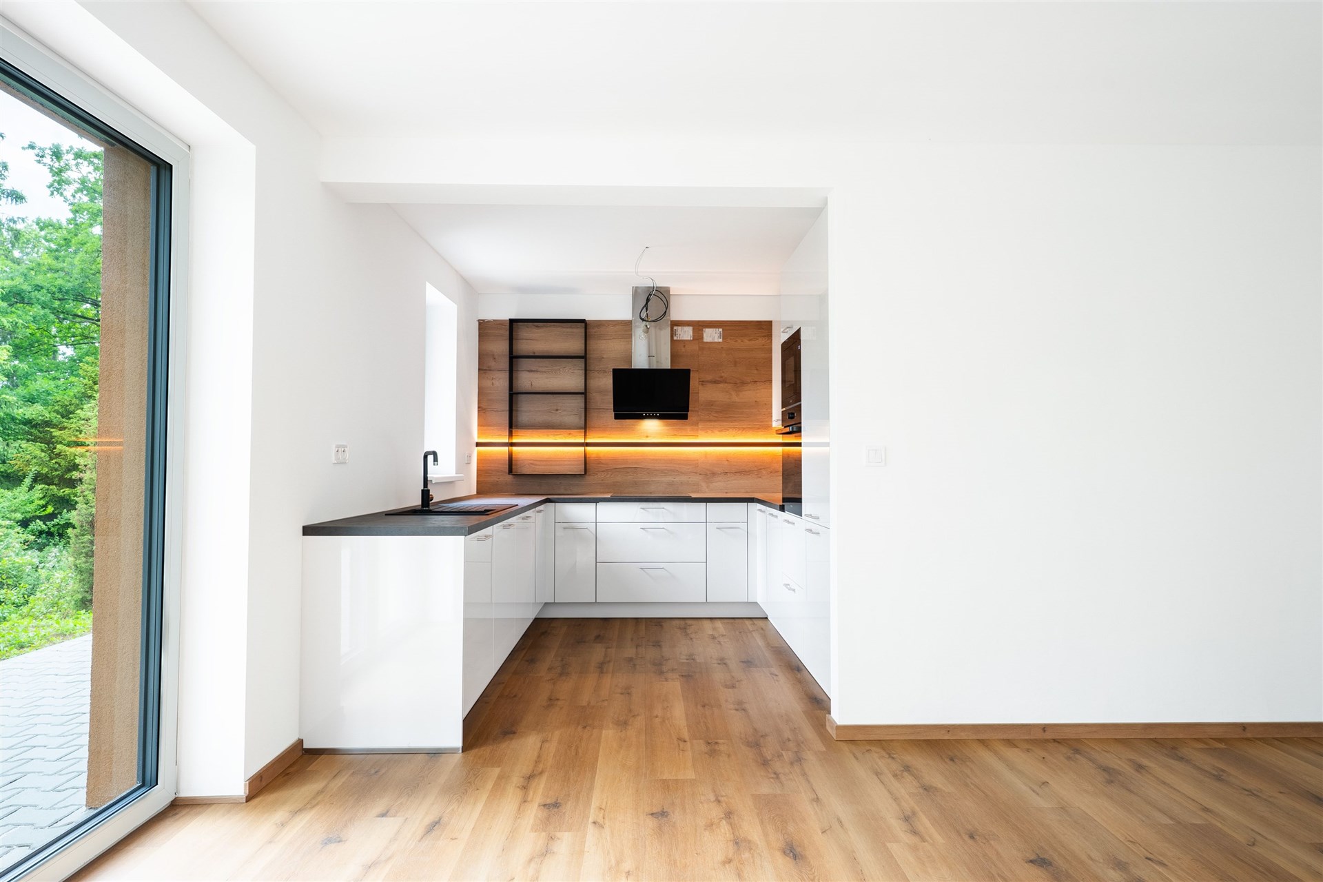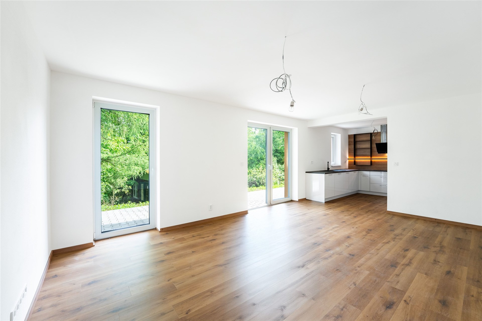 Prostorný obývací pokoj s velkou moderní kuchyňskou linkou a přímým vstupem na terasu, která obklopuje téměř celý dům. Prezentujeme kuchyni z domu C a dům C, který je již pronajatý. Aktuální dům B a kuchyně bude inzerována po její instalaci začátkem prosince 2025. Domy jsou postavené ve stejném standardu.
