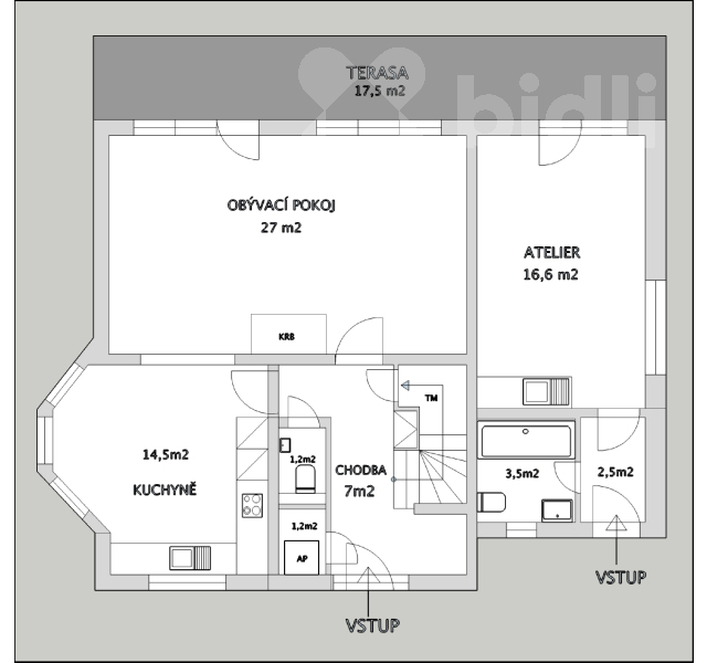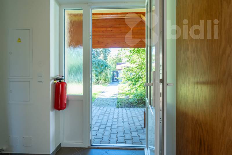 Dům má navíc ateliér se samostatným vstupem. Ten má vlastní koupelnu s vanou a toaletou, malý kuchyňský kout a vstup na zahradu přes terasu. Je ideální pro hosty, samostatné bydlení nebo pracovní využití.