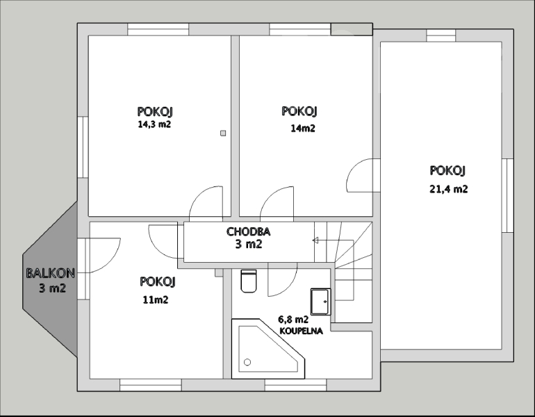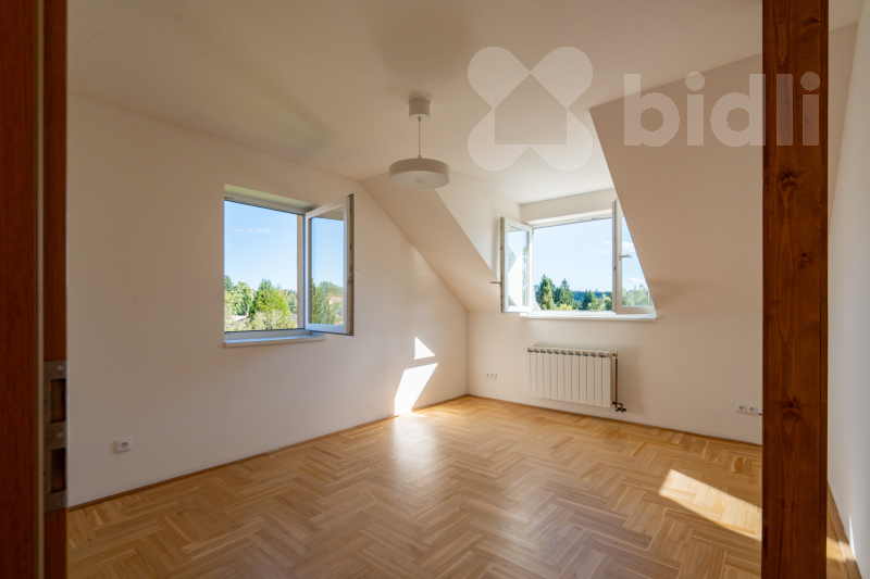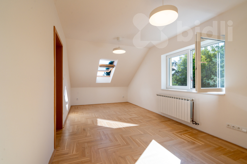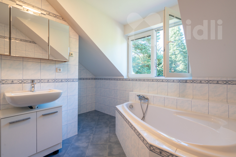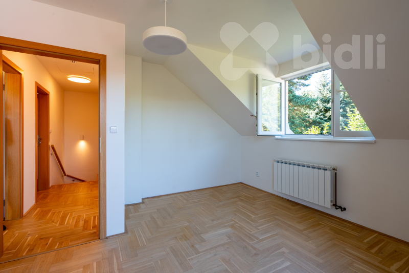 Po dubových schodech vystoupáte do patra, kde jsou čtyři ložnice. Jedna z nich má vlastní balkon orientovaný na východ, ideální pro ranní relaxaci. Prostorná koupelna je vybavena velkou vanou a druhou toaletou.