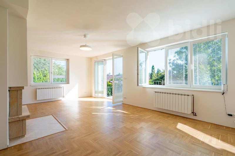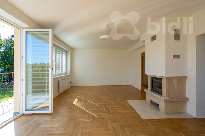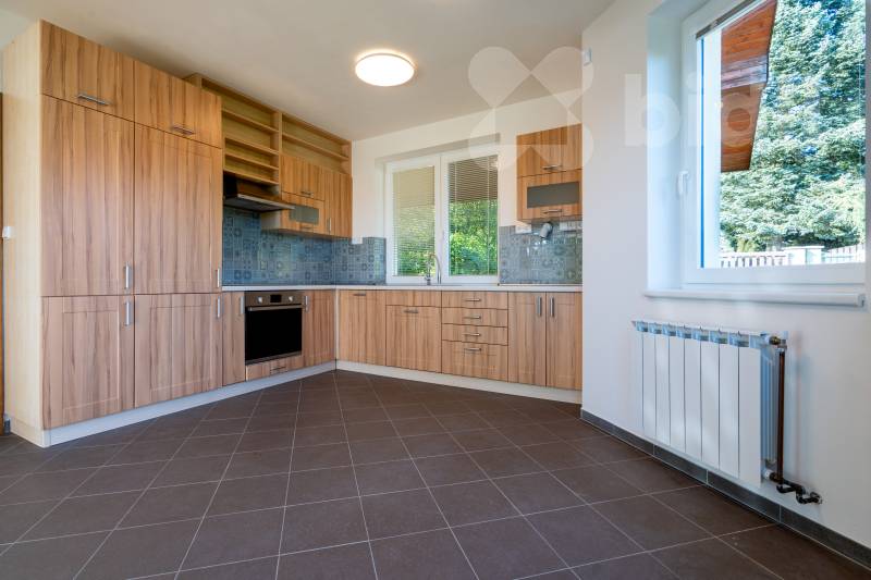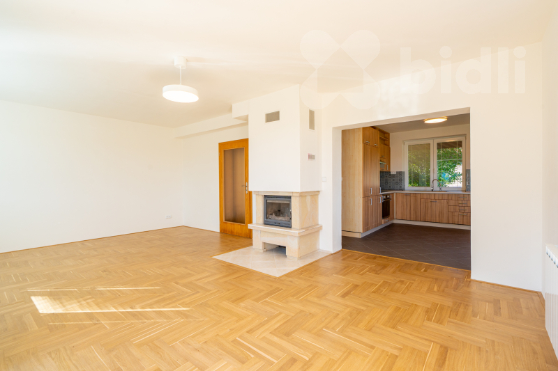V přízemí se nachází kuchyň s okny do zahrady, která je plně vybavena moderní kuchyňskou linkou a nabízí dostatek místa pro jídelní stůl. Velký obývací pokoj, kde krb vytváří příjemnou pohodu, má přímý vstup na jižně orientovanou terasu s výhledem do zahrady.