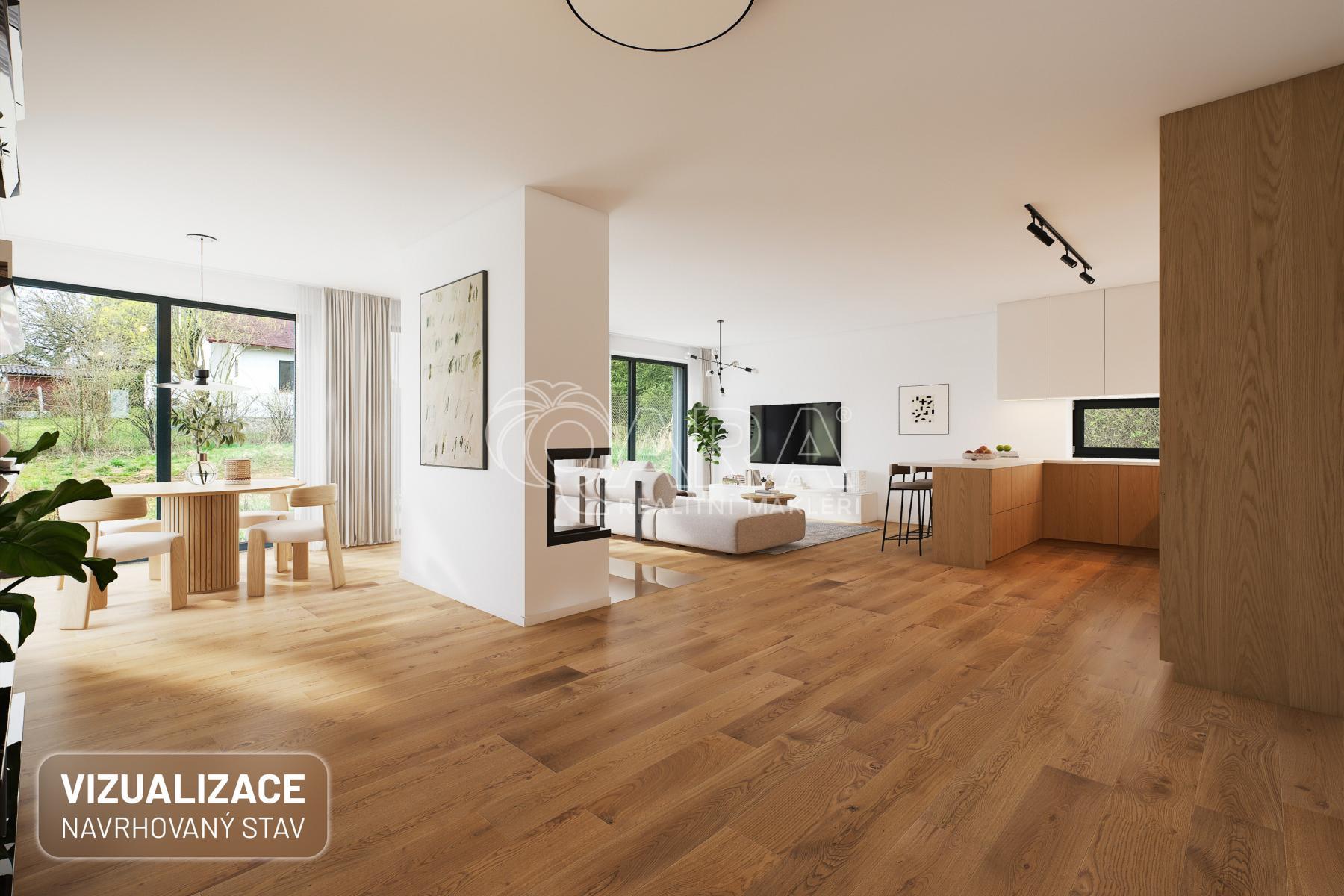 Dominantou je velkorysý obývací prostor s kuchyní o velikosti 53 m and sup2; ideální pro společné chvíle, rodinné oslavy i každodenní život.