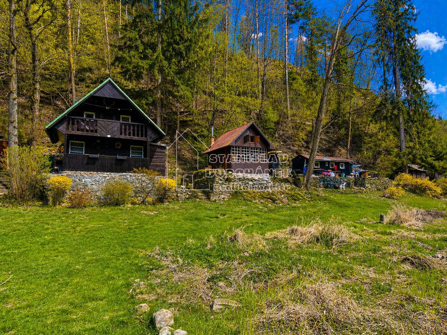 Pozemek je pronajatý od obce. Od parkování se k chatě dostanete přibližně za 5 minut chůze lesní cestou pro pěší. Pitná voda je dostupná ze studánky na protějším břehu řeky.