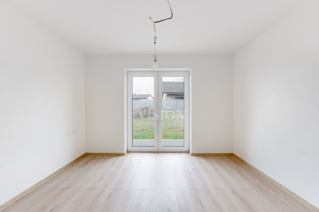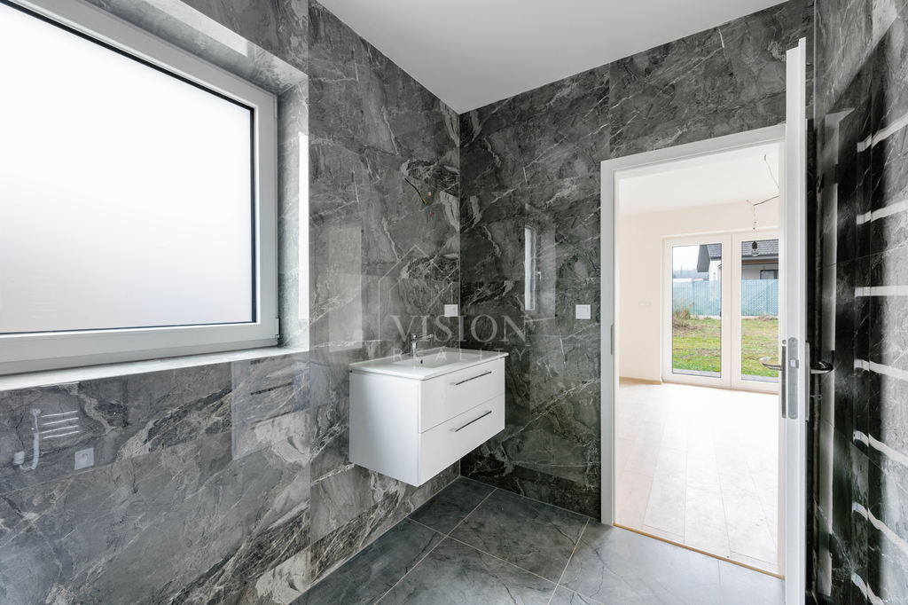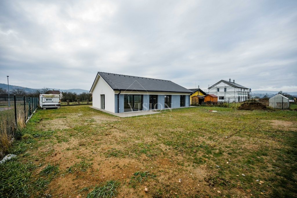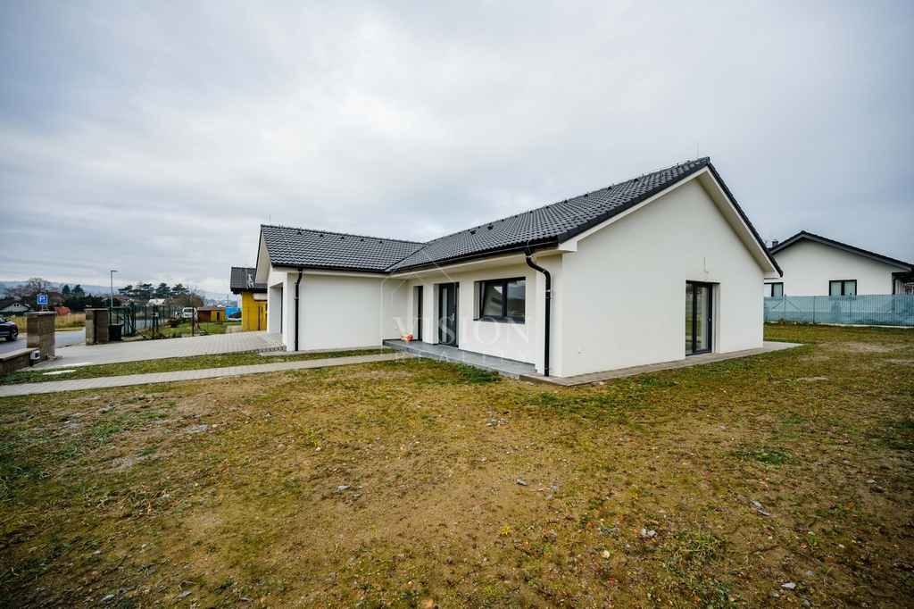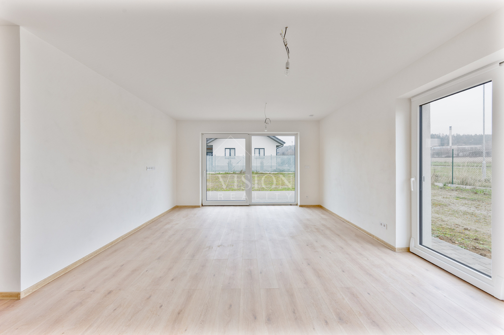 Dům o dispozici 4+kk nabízí 152 m² užitné plochy a stojí na oploceném pozemku 866 m². Z prostorné chodby můžeme vejít do garáže, což oceníme především v zimním období nebo projdeme do prostorného obývacího pokoje s kuchyňským koutem. Dále jsou zde dva pokoje a ložnice, která má i svou vlastní koupelnu. Nadstandardně velká okna zajišťují maximální prosvětlení interiéru a každý pokoj má přímý vstup na terasu a zahradu. K dispozici je další koupelna a také technická místnost, která poskytuje dostatek prostoru i jako úložný prostor.