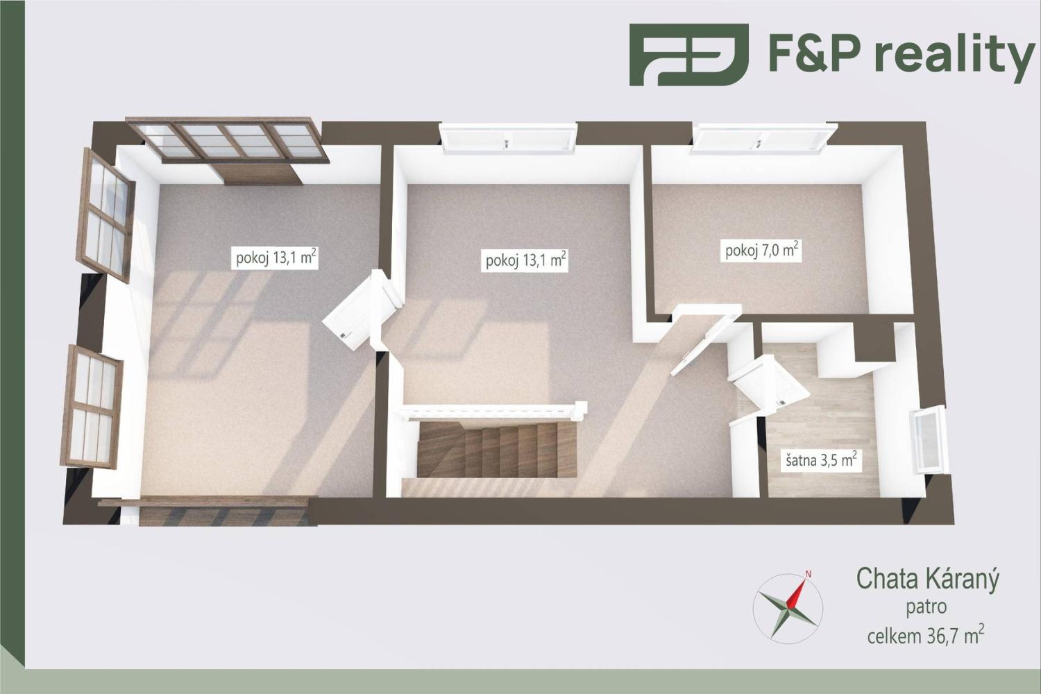 V patře jsou tři místnosti s plnohodnotnými lůžky, prostřední pokoj nad schody je průchozí. K dispozici je koupelna se sprchovým koutem a toaletou, dále komora.