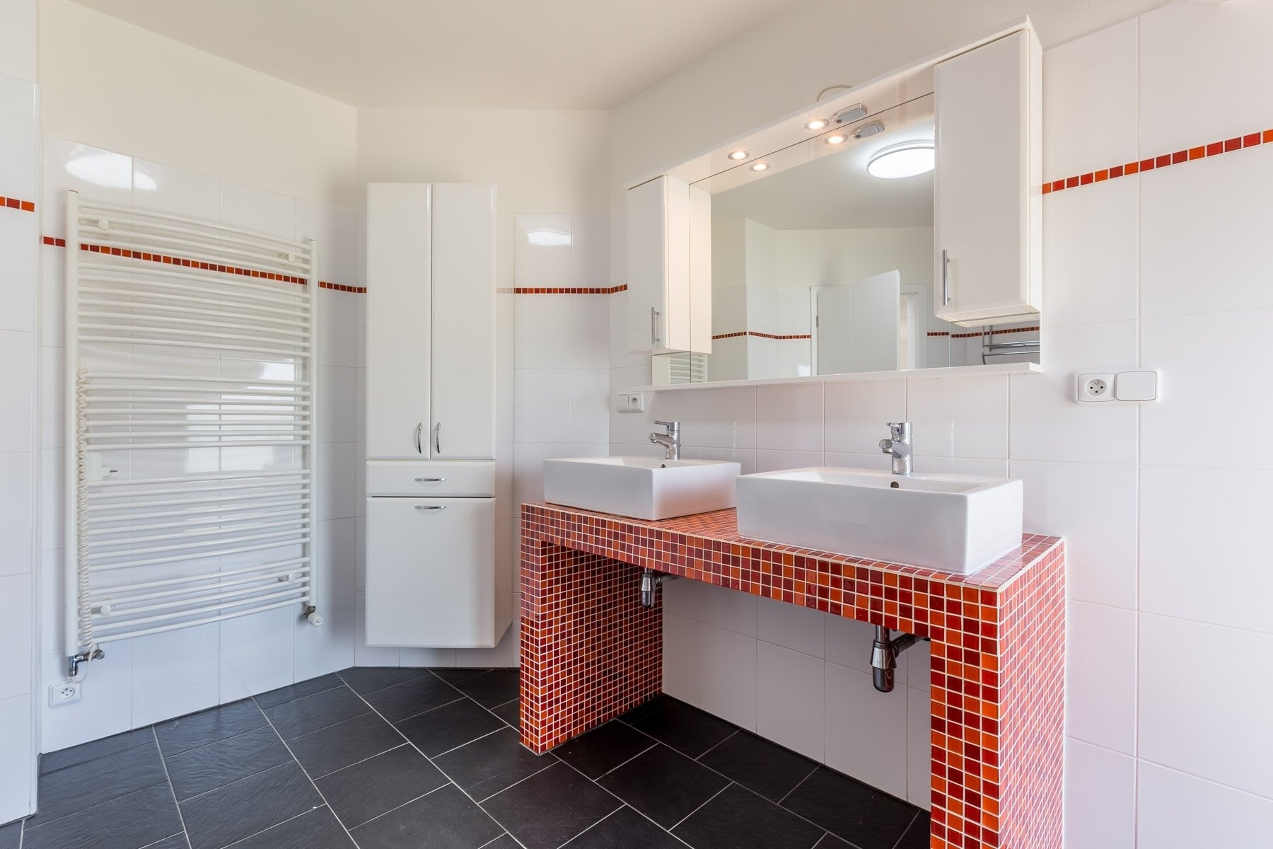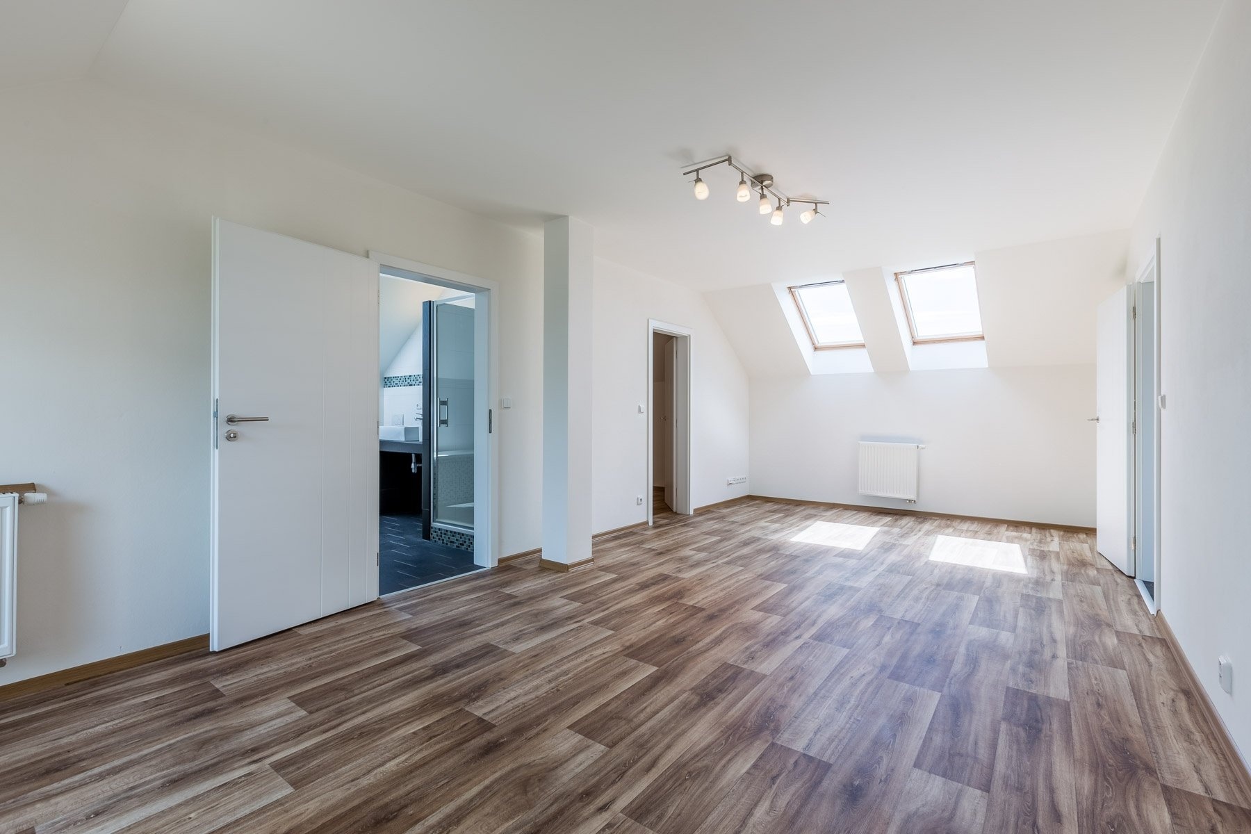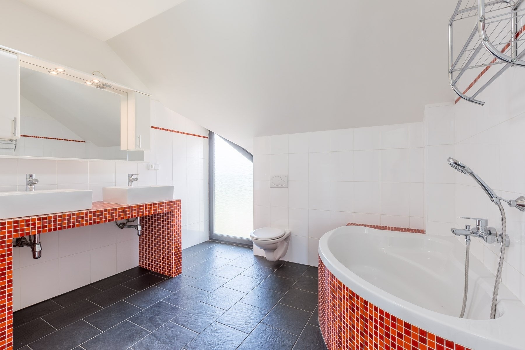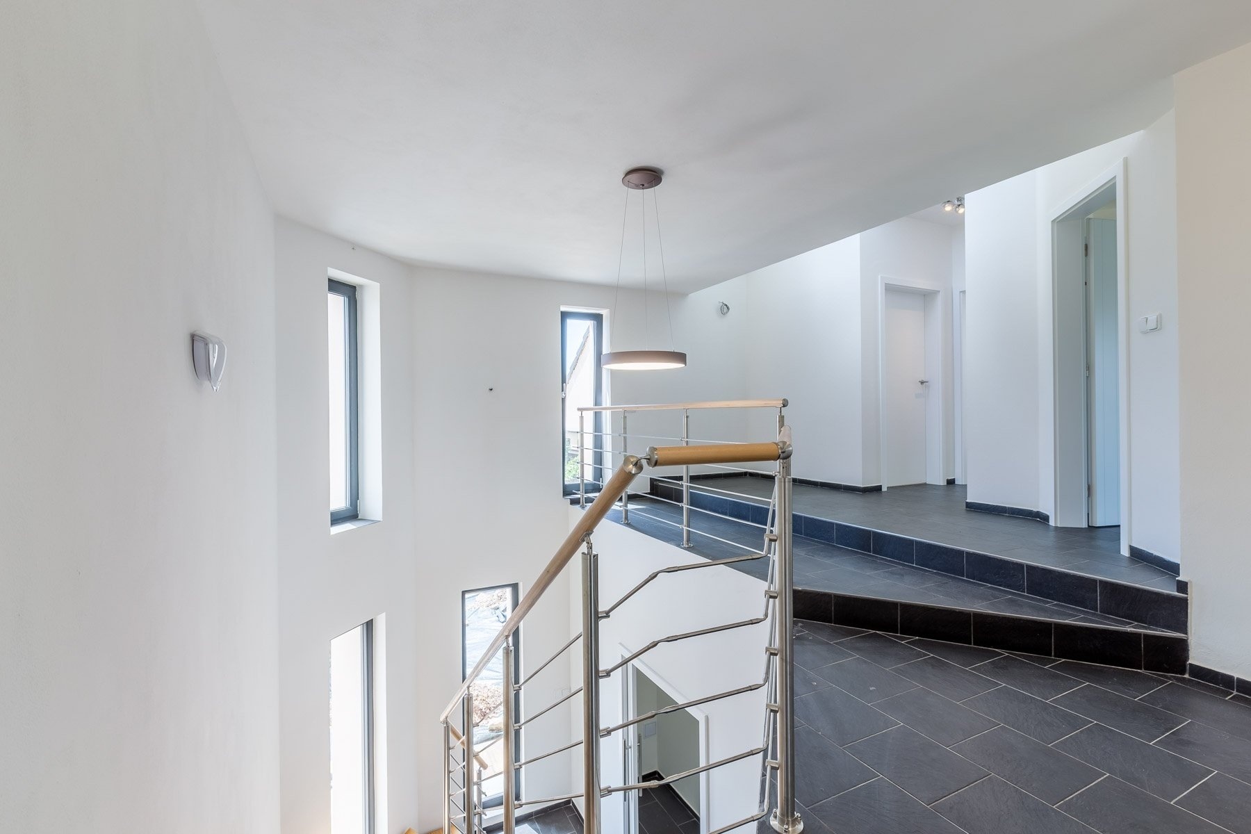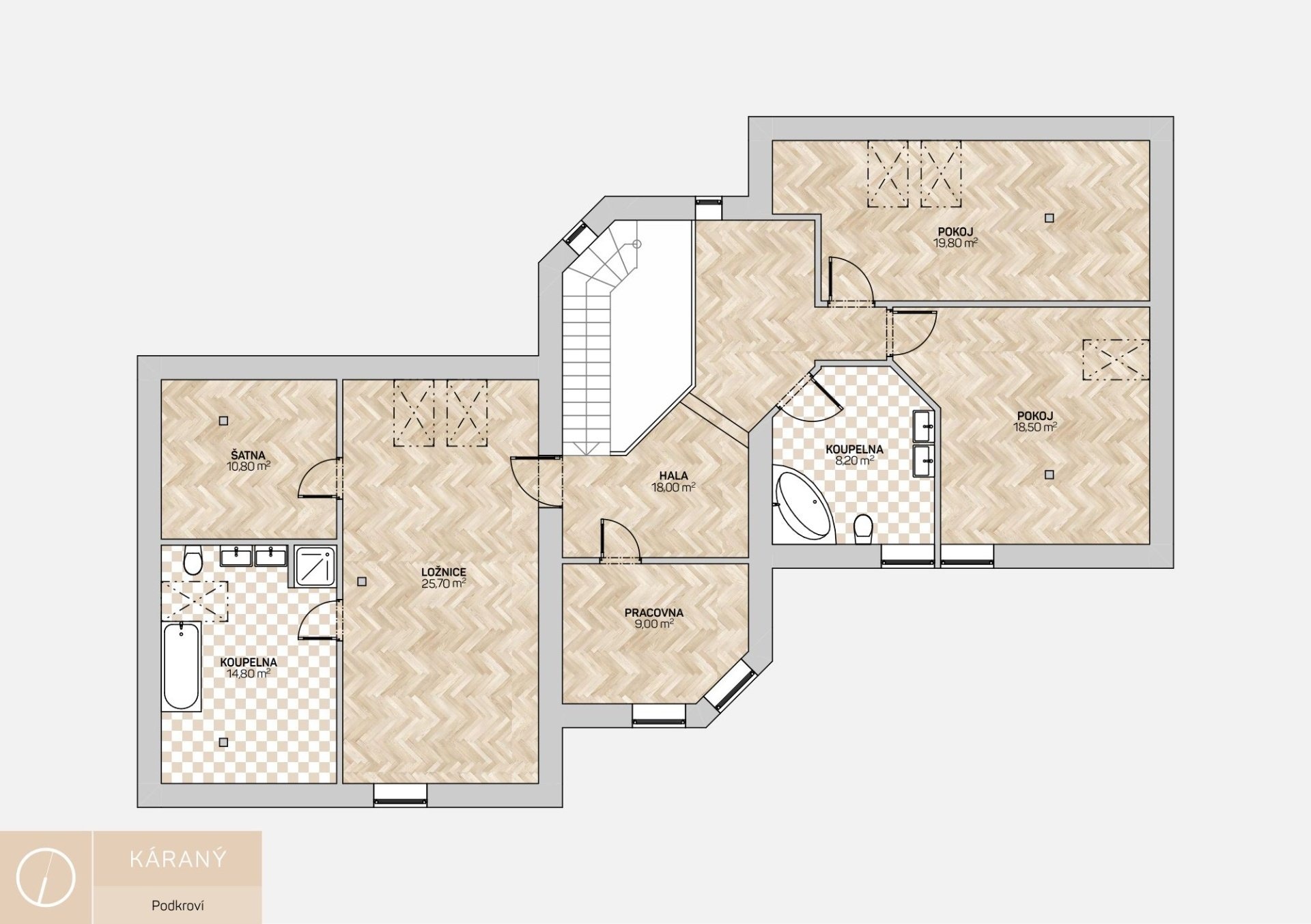 V 2.NP se nachází velká ložnice s šatnou a prostornou koupelnou se sprchovým koutem, vanou a toaletou a ještě s dalším prostorem, např. pro saunu. Dále je zde pracovna, dva pokoje, druhá koupelna s vanou a toaletou. Součástí domu jsou dvě prostorné půdy.