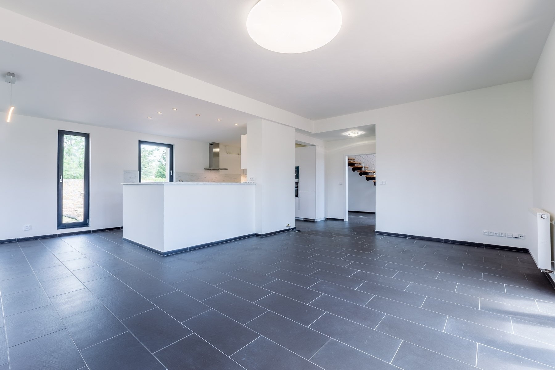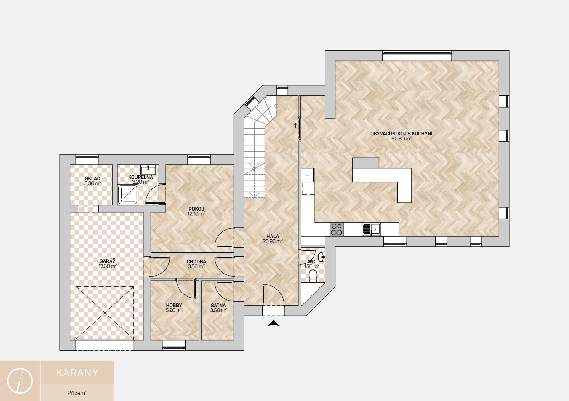 V 1.NP se nachází vstupní hala, šatna, WC, technická místnost, garáž s přímým propojením (tzv. suchou nohou) s domem, pokoj pro hosty s koupelnou a vlastním vstupem na terasu a dále obývací prostor s jídelnou s kuchyňským koutem - opět se vstupem na terasu.