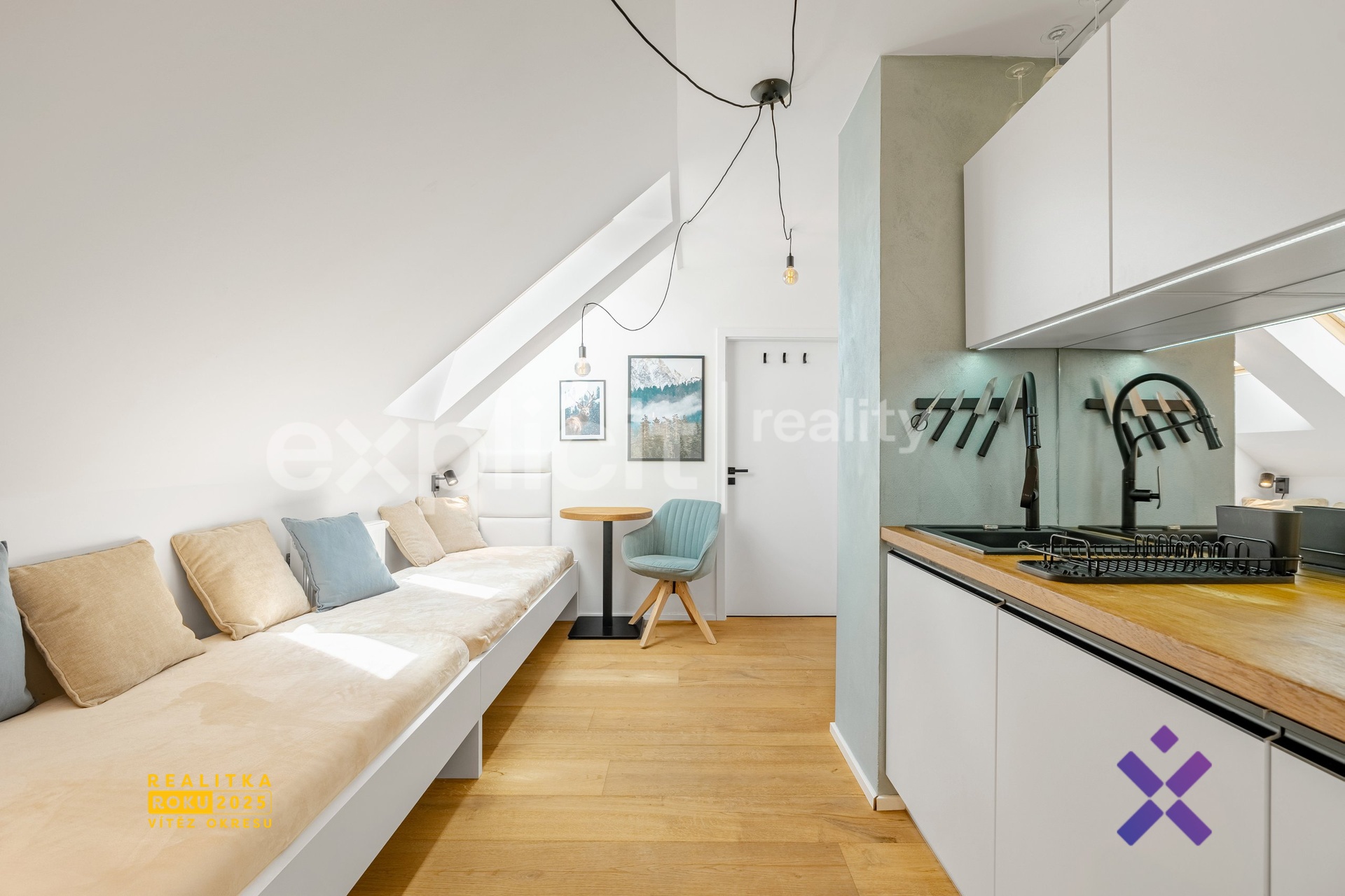 Interiér byl navržen s důrazem na moderní design a kvalitní provedení. Při rekonstrukci byly použity vysoce kvalitní materiály a celý apartmán je ve výborném, udržovaném stavu. Podlaha je vyrobena z masivního dubového dřeva. Dům, ve kterém se apartmán nachází, prošel kompletní rekonstrukcí před dvěma lety, je zateplený a společné prostory jsou ve výborném stavu díky aktivnímu fondu oprav.