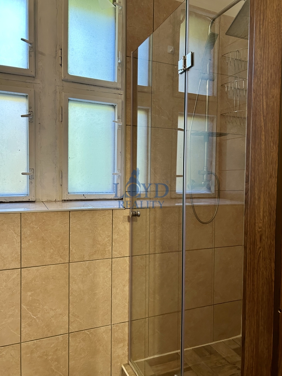 V prostorné koupelně s oknem je sprchový kout, WC je samostatně.