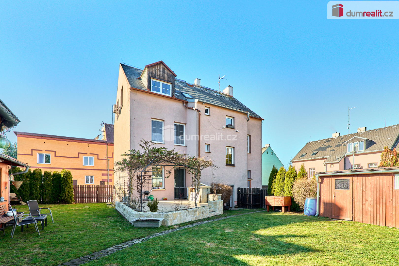 Součástí prodeje je také podíl na další společné zahradě, kde mají majitelé k dispozici zapuštěný bazén a zděnou garáž pro jeden automobil. Nemovitost se nachází v klidné části města s výbornou dostupností – v docházkové vzdálenosti je zastávka MHD, škola, školka, supermarket, restaurace, pošta, posilovna i koupaliště.