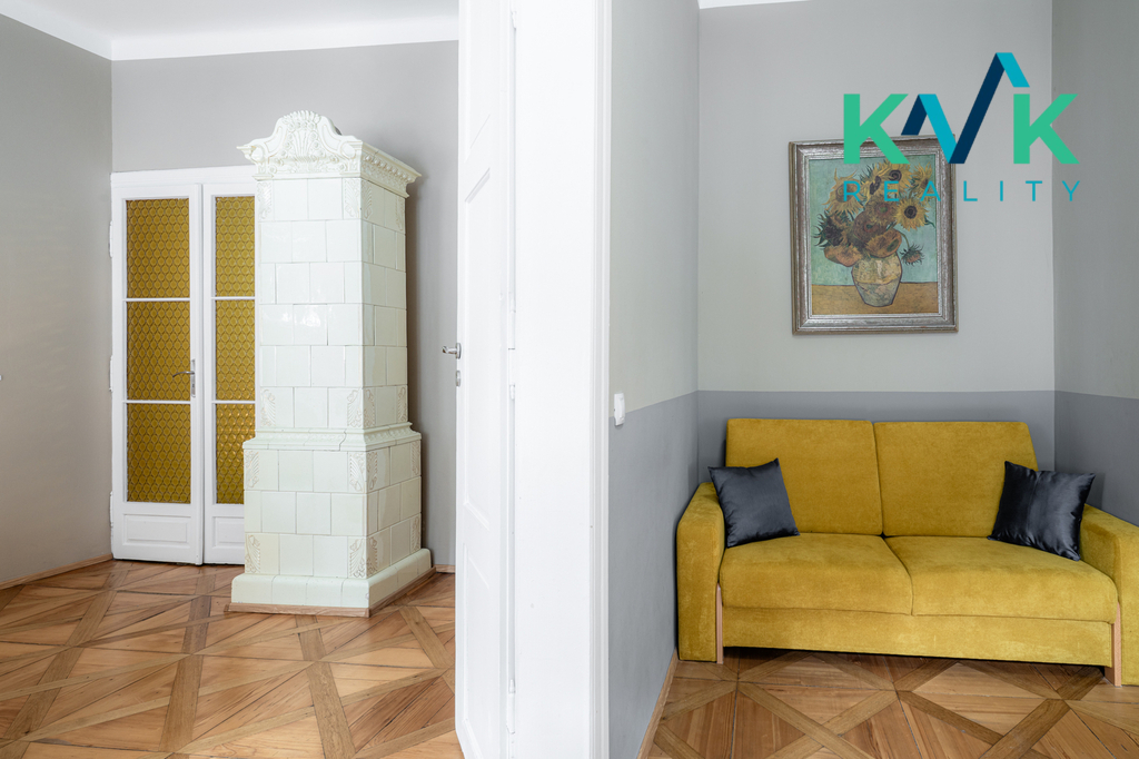 Celé první patro patří pouze Vám. Disponuje dvěma samostatnými vstupy, což zásadně zvyšuje jeho variabilitu. Dispozičně je řešen velmi prakticky – z obou vstupů procházíte chodbou do jednotlivých částí bytu (koupelny, kuchyně, pokoje), přičemž střed bytu tvoří společná jídelna s rozkládacím gaučem, která propojuje oba celky. V jedné z ložnic se nachází původní kachlová kamna, která dotváří jedinečnou atmosféru.