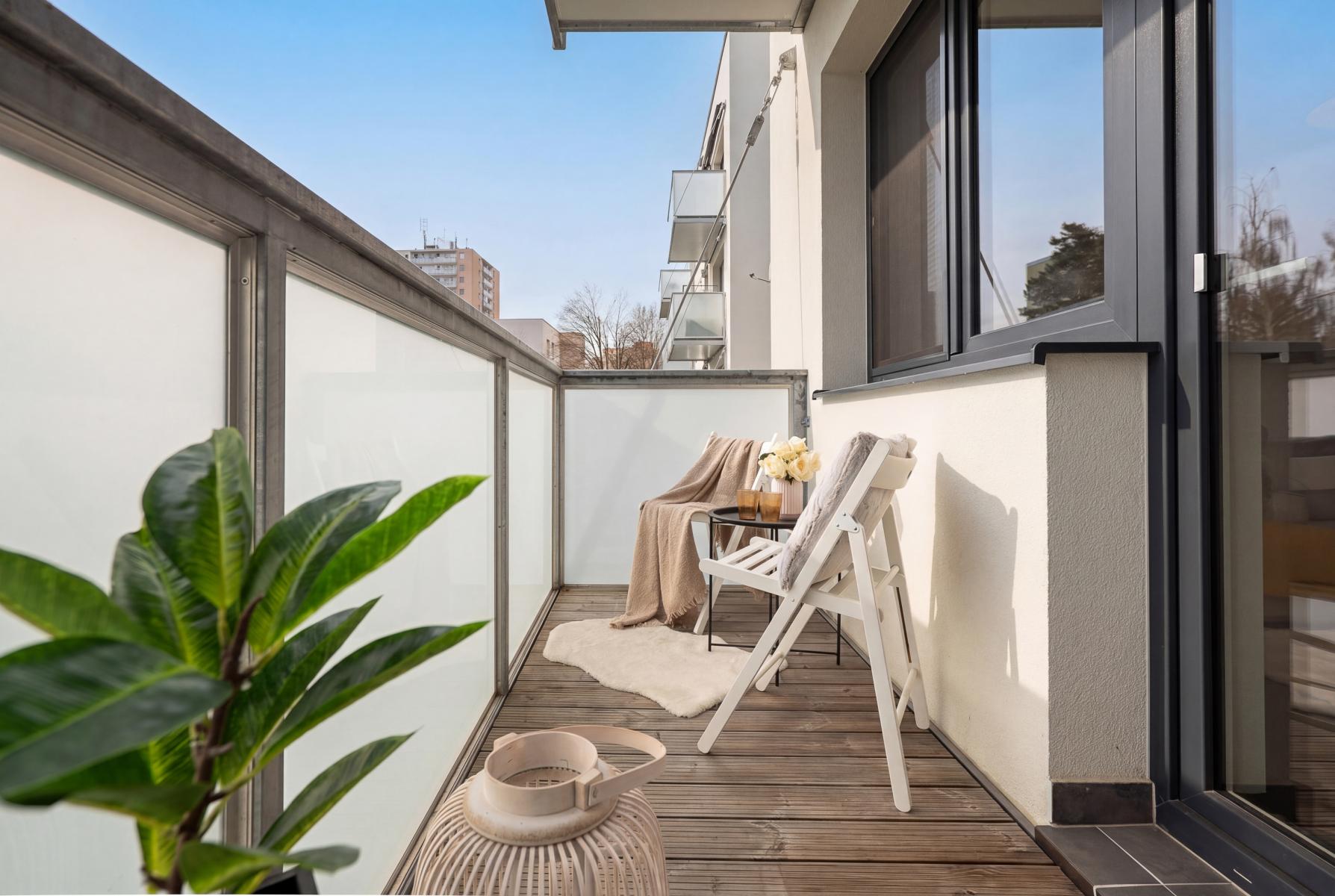 Podlahová plocha bytu činí 84 m and sup2;, k bytu náleží balkon o velikosti 4,5 m and sup2;, ideální pro odpočinek, a prostorná sklepní kóje v přízemí domu.