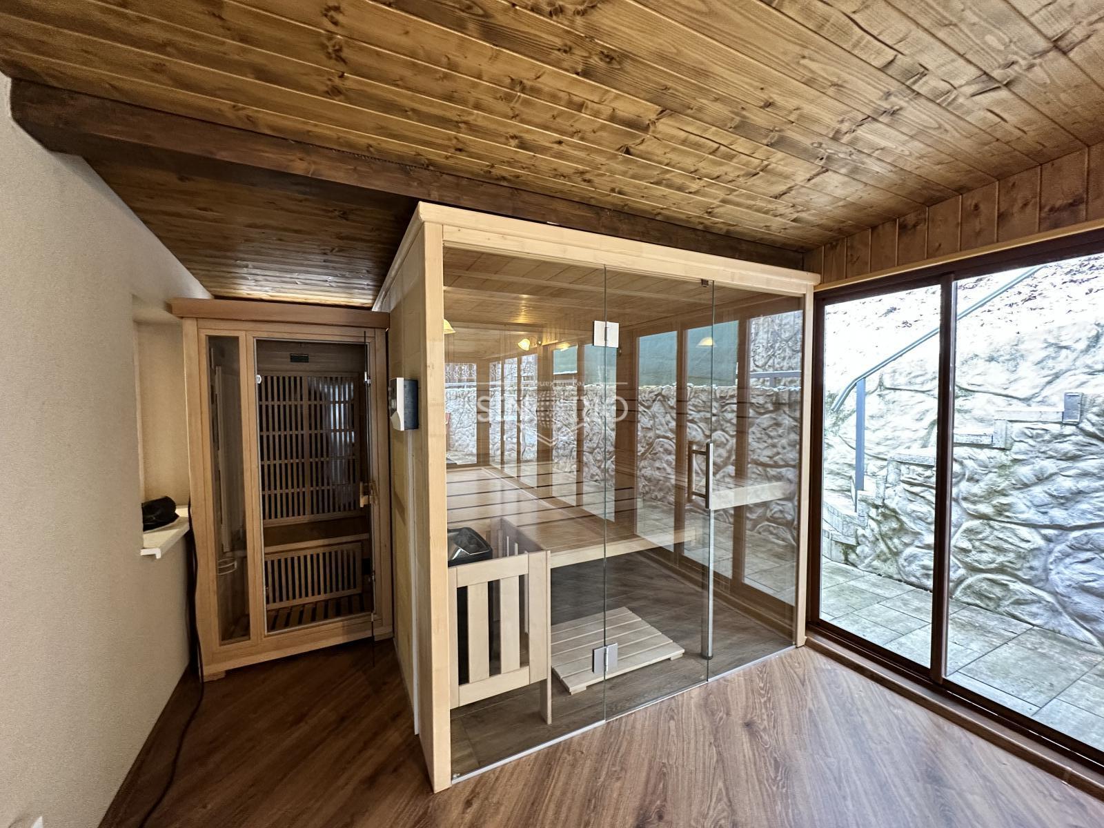 Dále zde vznikl další prosklený prostor pro hosty, kde se nachází sauna a vstup na zahradu s vířivý bazén.