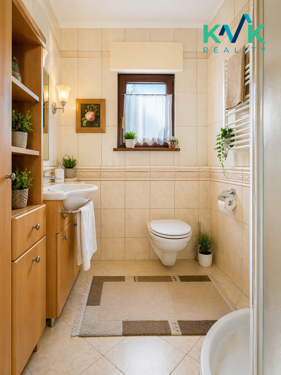 koupelna se sprchovým koutem, umyvadlem a WC