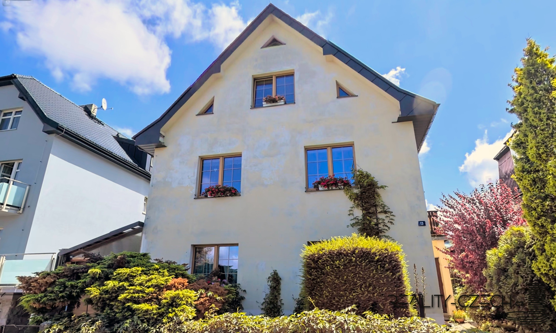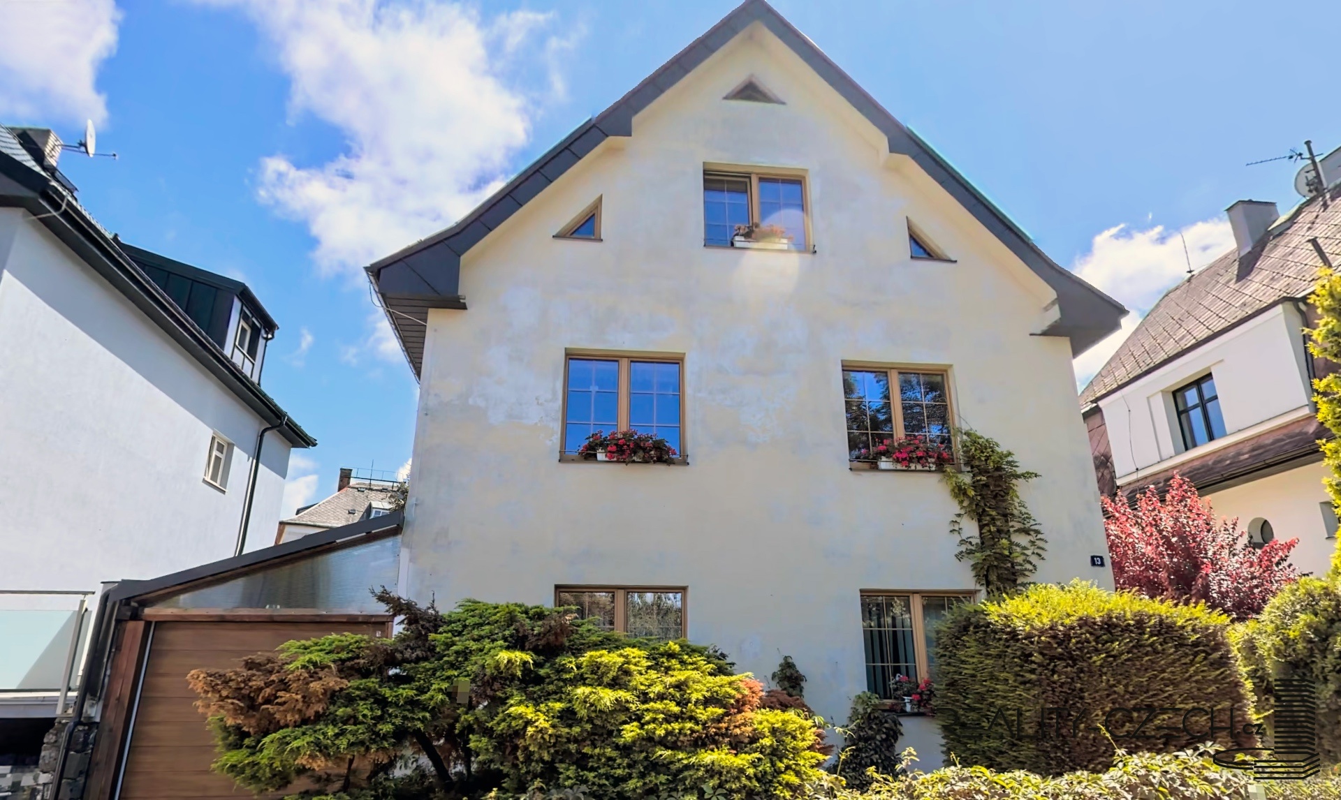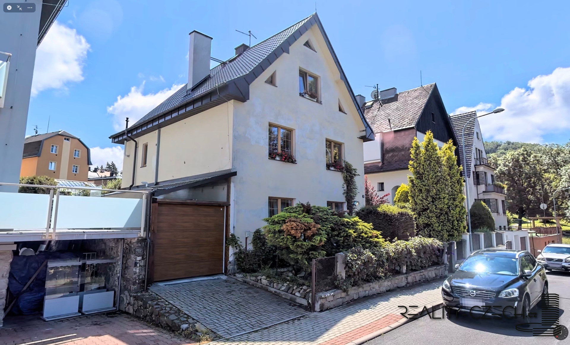 Prodej vily (možnost dvougeneračního rodinného domu) ve vyhledávané vilové čtvrti Horní Drahovice v Karlových Varech. V domě jsou dva oddělené byty: 4+1 (mezonet v 1. a 2. patře propojený elegantním dřevěným samonosným schodištěm) a 2+1 (přízemí se vstupem na zahradu), každá s vlastním plynovým kotlem, mezonet navíc disponuje novými kachlovými kamny na tuhá paliva, samozřejmostí jsou a oddělené měřiče spotřeb; oba byty jsou po kompletní rekonstrukci (nová plastová okna - trojskla, rámy v dekoru dřeva, nové rozvody vody, plynu, elektřiny a topení, nová topná tělesa, nové či renovované podlahy /renovovaná dřevěná prkenná, renovované parkety a plovoucí podlahy/, nové dlažby a sanita, kuchyňská linka na zakázku). Provedeny jsou drenáže kolem celého domu, položena nová střešní krytina. K dispozici je kryté parkování pro auto na vlastním pozemku u domu. K domu patří rozlehlá udržovaná okrasná a ovocná zahrada s novým dřevěným altánem. Nemovitost je ve výborném dosahu lázeňského centra (cca 10 min. pěšky od hotelu Thermal) a zároveň ve velmi klidné lokalitě. Výhodná je orientace domu v linii V-Z, který je tak prosluněný celý den.