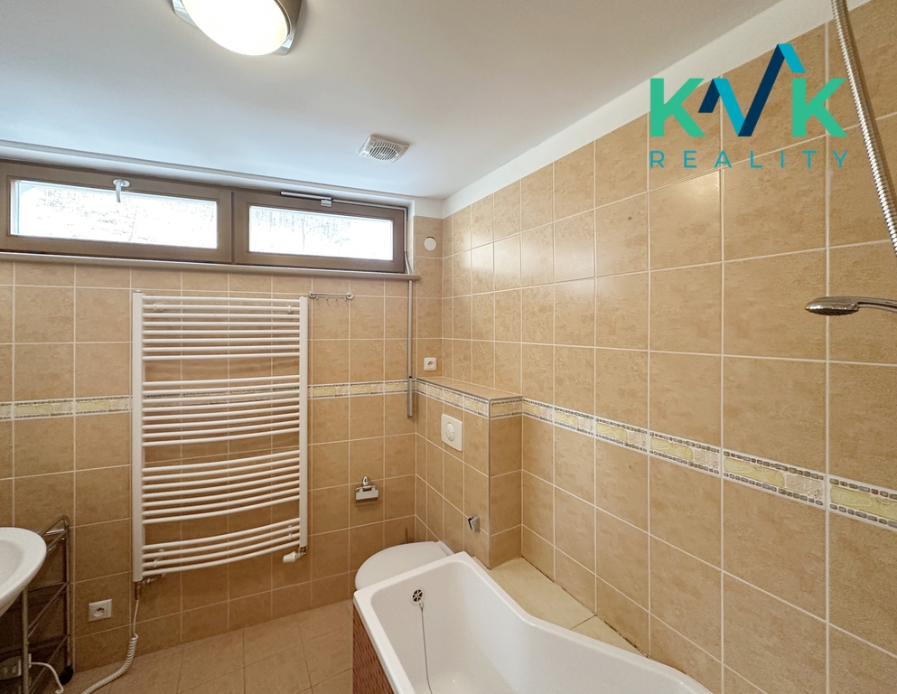 Koupelna je prakticky vybavena sedací vanou, umyvadlem, WC a pračkou, což přispívá k pohodlí každodenního bydlení. Velkou předností bytu jsou unikátní výhledy na historickou lázeňskou část Karlových Varů, včetně pohledů na Vřídlo, kolonádu a lázeňskou promenádu.