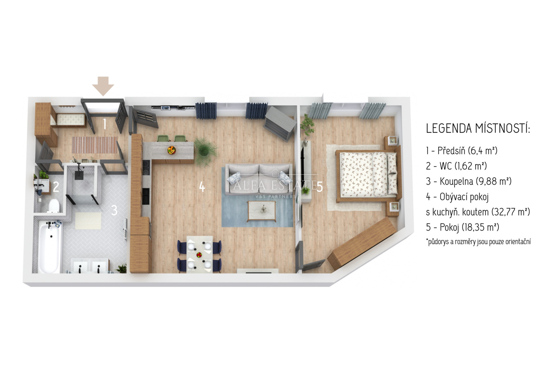 Interiér bytu byl navržen s důrazem na prostor, světlo a nadčasovou eleganci. Po vstupu do bytu vás přivítá předsíň, ze které se otevírá vstup do velkorysé koupelny zpracované do posledního detailu. Ta nabízí jak komfortní vanu pro relaxaci, tak prostorný sprchový kout a je doplněna vysoce kvalitními designovými doplňky. Samostatná toaleta zajišťuje maximální komfort a soukromí.