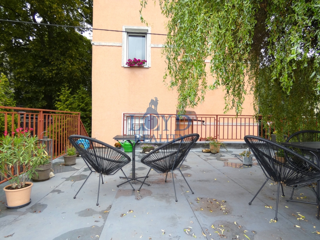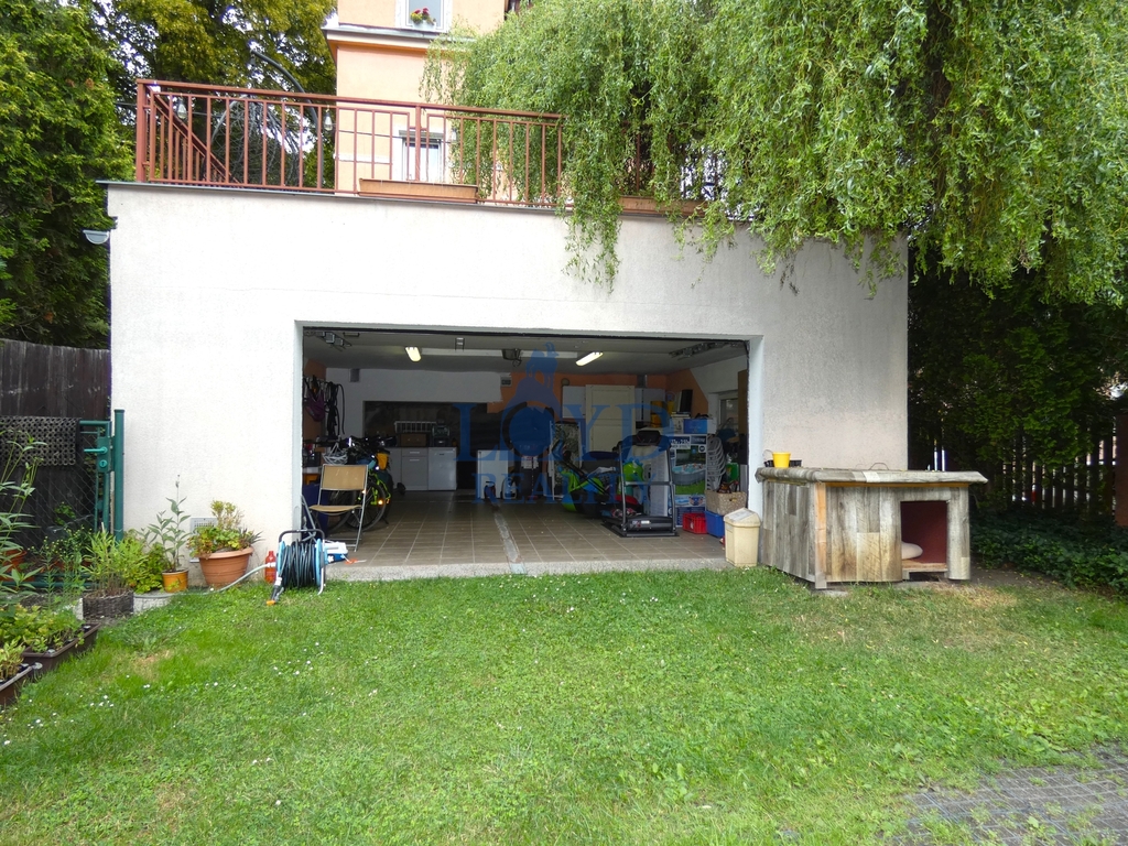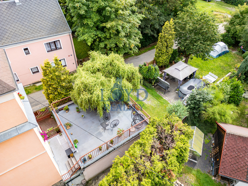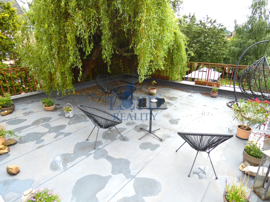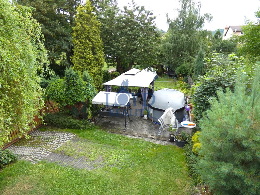 Velká terasa na střeše garáže. Udržovaná zahrada, altán, travnatá plocha.