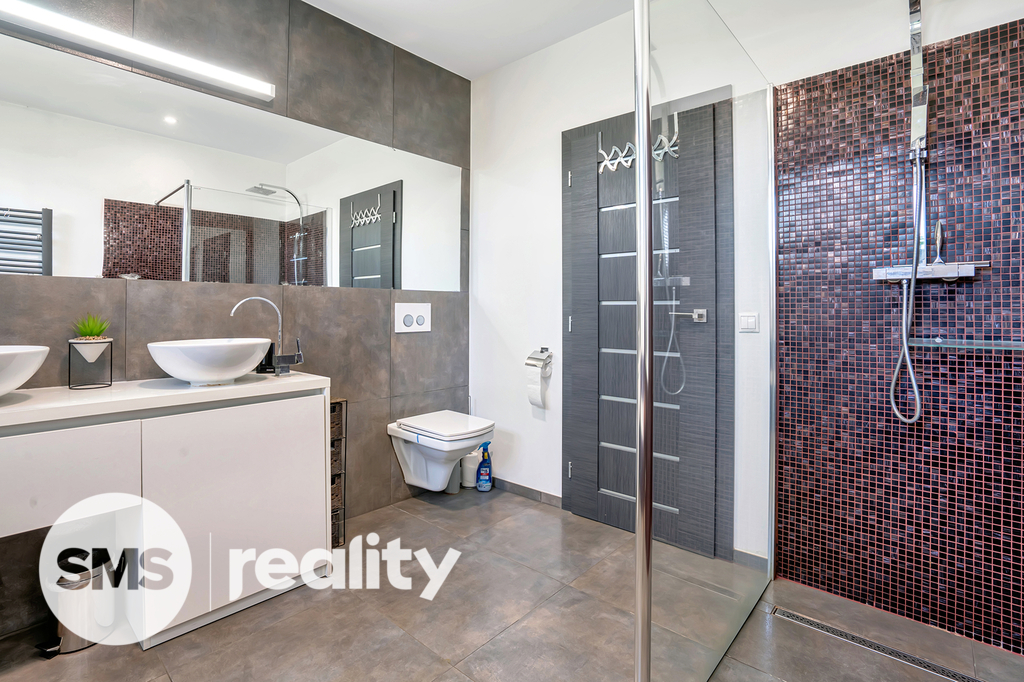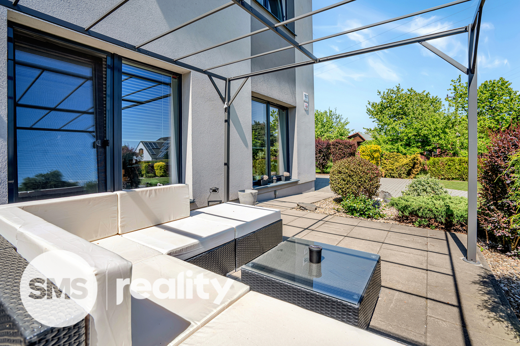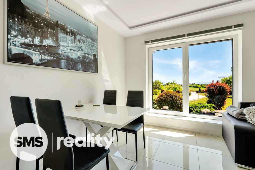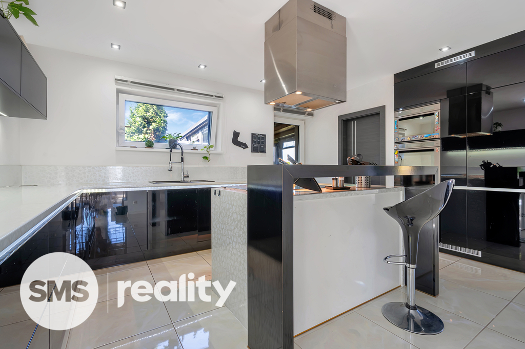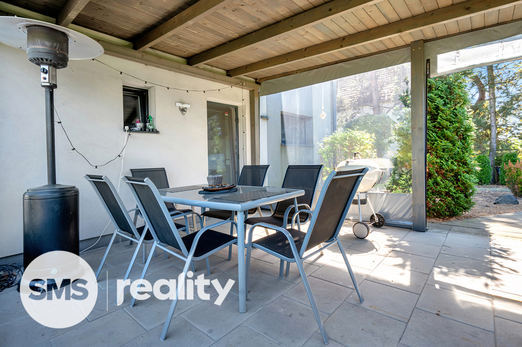 Dispozice 4+1 s podlahovou plochou 133 m² poskytuje dostatek prostoru pro rodinné bydlení. V přízemí se nachází otevřený obytný prostor s moderní kuchyní, která má přímý vstup na zadní zastřešenou terasu, a obývací pokoj s krbem a výstupem na čelní terasu s pergolou a příjemným posezením. Kuchyňská linka je součástí prodeje a obsahuje veškeré vestavné spotřebiče (elektrická a mikrovlnná trouba, myčka, digestoř) i praktickou komoru na potraviny.