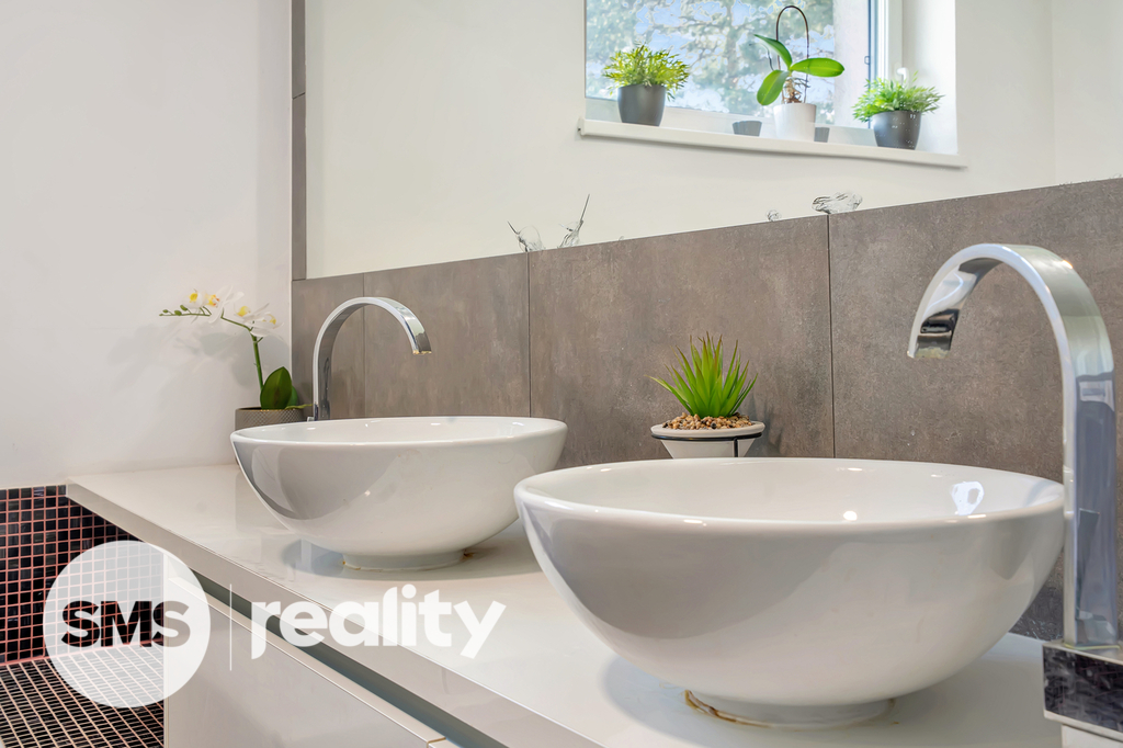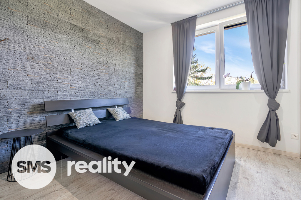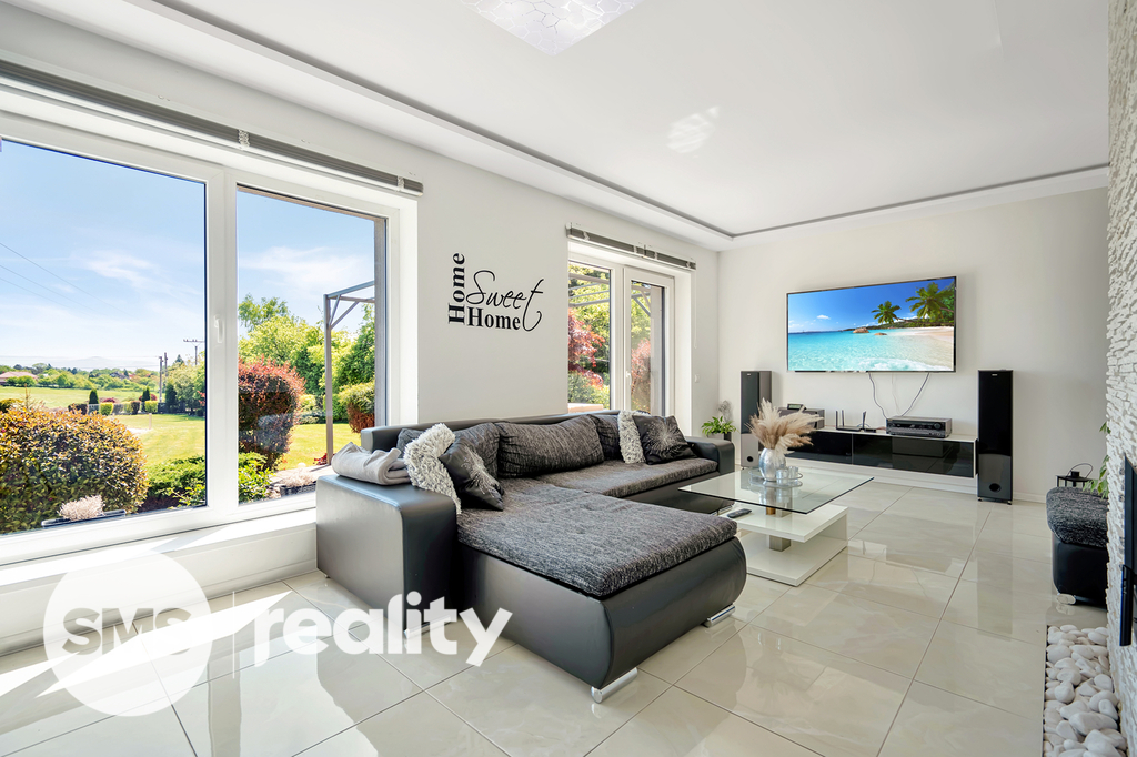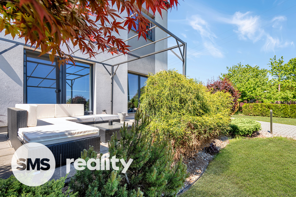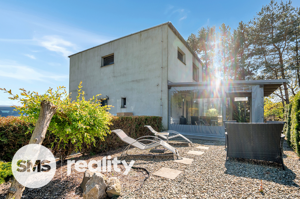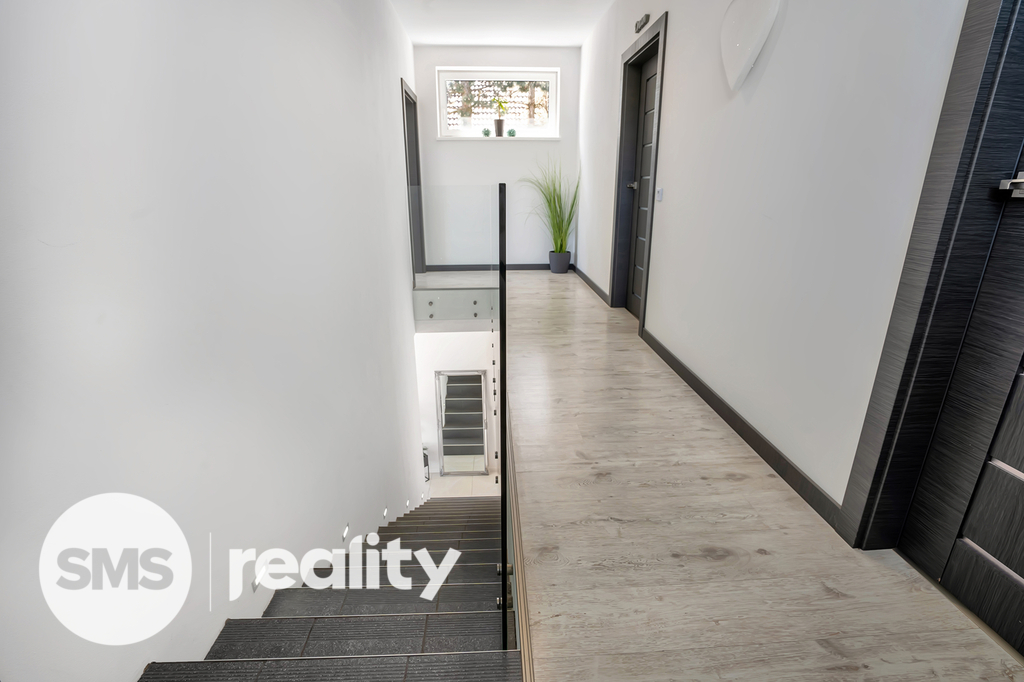 Dispozice 4+1 s podlahovou plochou 133 m² poskytuje dostatek prostoru pro rodinné bydlení. V přízemí se nachází otevřený obytný prostor s moderní kuchyní, která má přímý vstup na zadní zastřešenou terasu, a obývací pokoj s krbem a výstupem na čelní terasu s pergolou a příjemným posezením. Kuchyňská linka je součástí prodeje a obsahuje veškeré vestavné spotřebiče (elektrická a mikrovlnná trouba, myčka, digestoř) i praktickou komoru na potraviny.