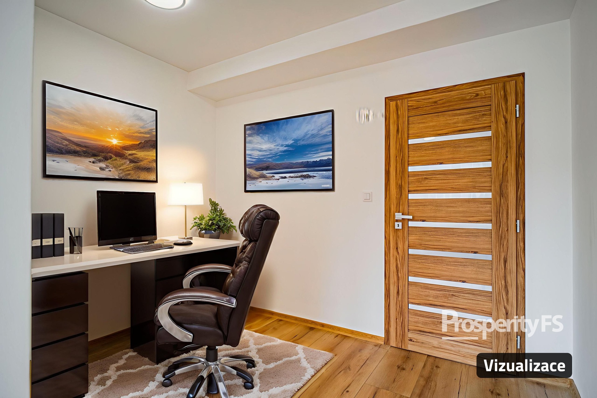Dispozičně byt nabízí vstupní chodbu, koupelnu, obývací pokoj a kuchyň. Z obývacího pokoje je vstup do pracovny či dětského koutku a díky dělené polopříčce vznikla samostatná ložnice se vstupem na balkon.