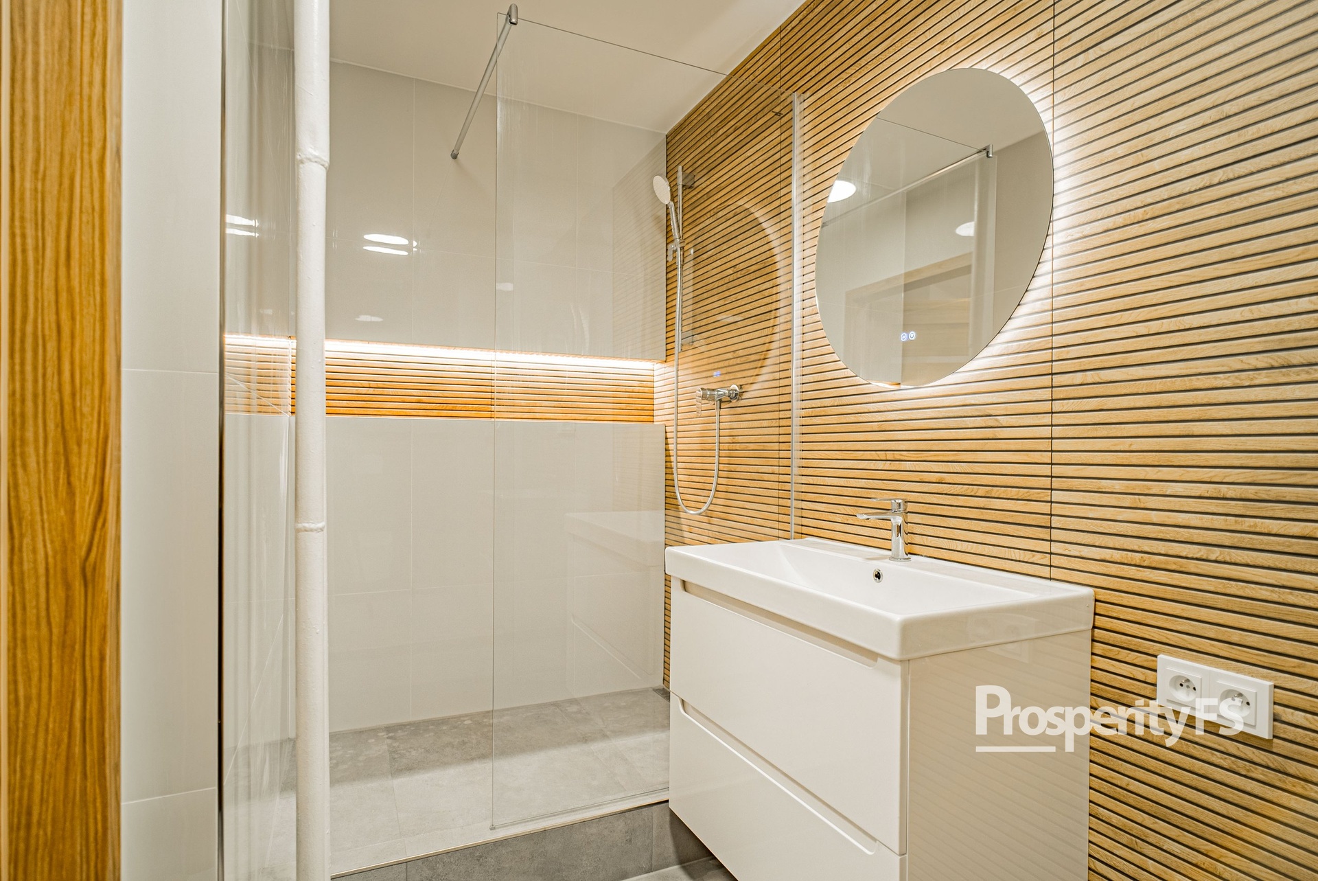 Byt je po kompletní rekonstrukci v roce 2025 a nabízí moderní, promyšlené a čisté bydlení bez nutnosti dalších investic. Nová kuchyňská linka v lesklém bílém designu je vybavena vestavnými spotřebiči a koupelna zaujme sprchovým koutem se žlábkem i místem pro pračku a sušičku s digitálním zrcadlem.
