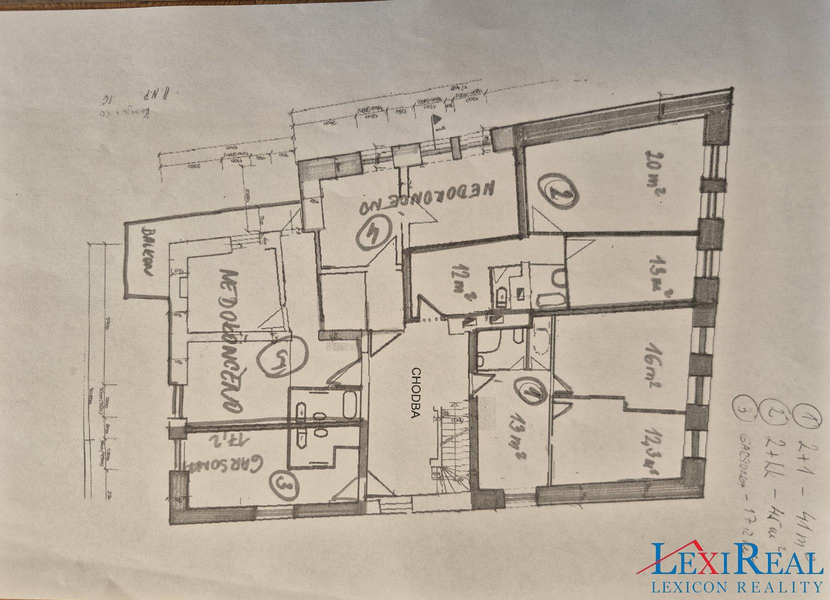 2. podlaží (189 m2) 1x byt 2+1, 1x byt 2+kk, 1x garsonka (připravené k okamžitému nastěhování). Dále dva byty (2+kk a 1+1) nedokončené, materiál k dispozici.