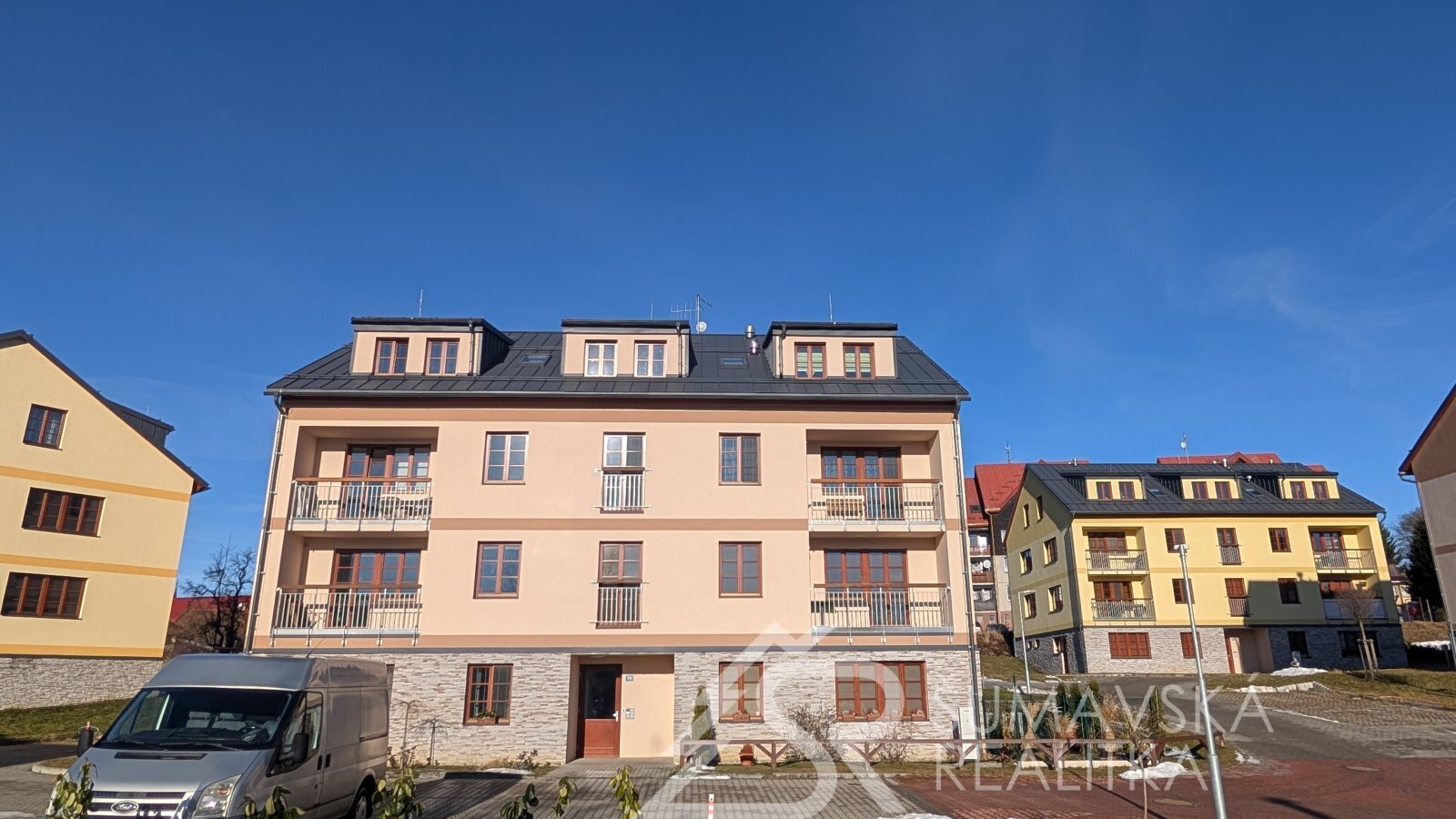 Popis: klasicky zděný bytový dům o 13 bytech byl realizovaný podle kvalitního autorského projektu arch. Radima Hucla. Je vybavený výtahem, v krásné poloze s výhledem na šumavská panoramata v jižně orientovaném pozemku, cca 2 min. pěší chůze od náměstí. Součástí bytu je i venkovní parkovacího stání. Komfortní byt je vybaven kvalitními standardy a výhodou je jižní balkón. Dům je připojen na městskou výtopnu biomasou, byt má samostatné měření tepla, vody a elektřiny. Jedná se o byt ve 2.NP o dispozici 2+kk a podlahové ploše 47 m2. Z chodby vybavené skříní a botníkem jsou vstupy do prostorného a prosvětleného obývacího pokuje s velkou kuchyňskou linkou, jídelním stolem a sedací soupravou. Lodžie s orientací na jih poskytuje výhled na lyžařský areál i možnost pobytu na čerstvém šumavském vzduchu. Samostatná ložnice s jižním oknem může sloužit i jako dětský pokoj. Velkorysá je i koupelna se sprchovým koutem, závěsným WC a pračkou. K bytu je sklepní kóje v přízemí, společná kolárna a jedno soukromé parkovací stání u domu. Objekt je dokonale zateplen a s okny s izolačními trojskly poskytuje perfektní tepelnou pohodu s minimálními náklady na vytápění.