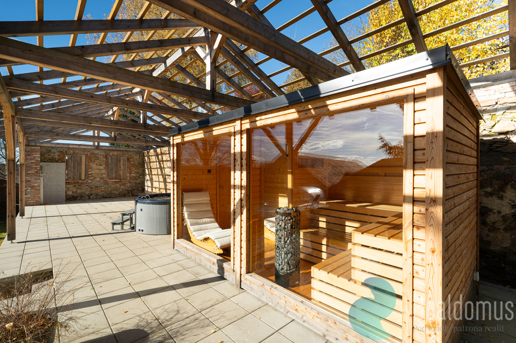 Na krásné relaxační zahradě se vzrostlými stromy je umístěno wellness: krytý bazén, sauna, vířivka, ochlazovací káď a venkovní terasa s posezením a grilem.