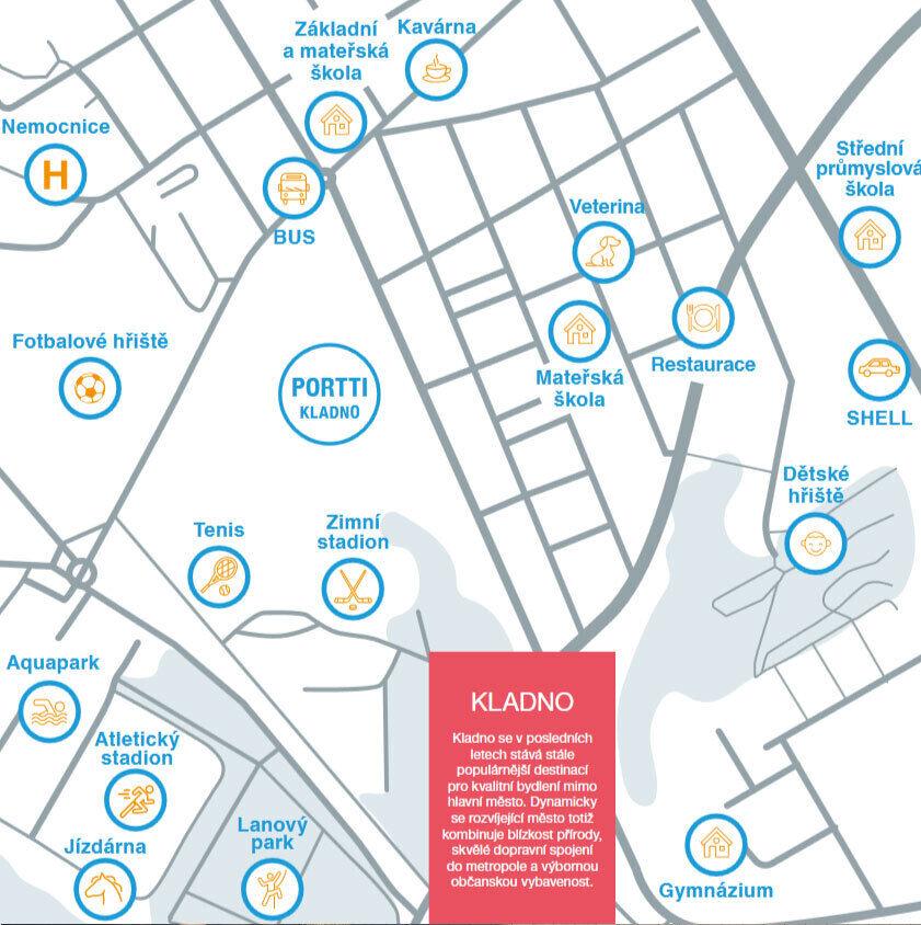 Významným benefitem je modernizované železniční spojení Kladno–Praha s novými zastávkami, přičemž nejbližší stanice se nachází přibližně 5 minut chůze od domu.