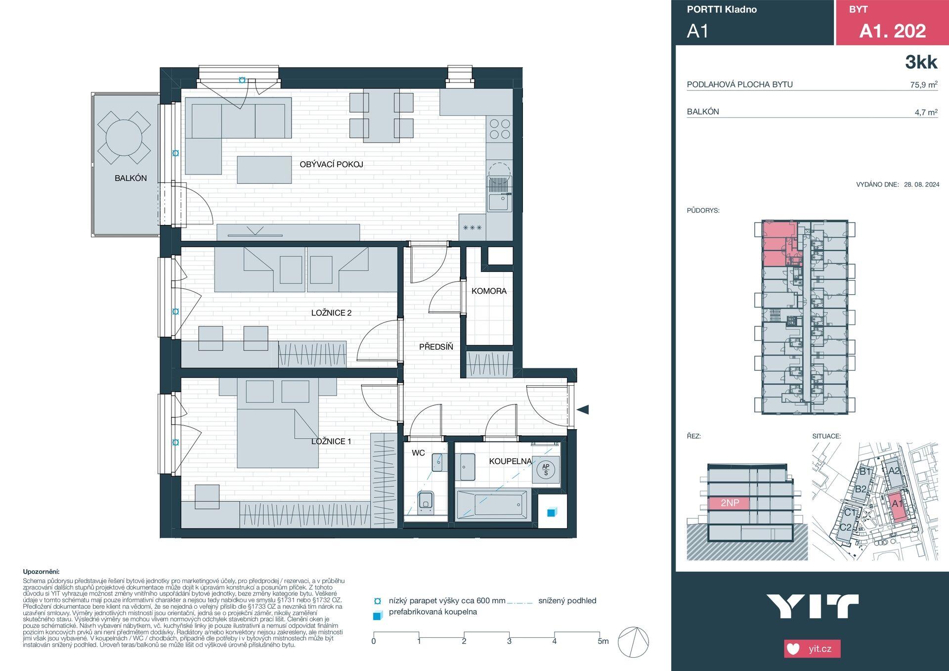 K bytu náleží balkon o velikosti 4,7 m², ideální pro odpočinek i každodenní relaxaci. Samozřejmostí je sklepní kóje a komfortní garážové stání přímo v domě.