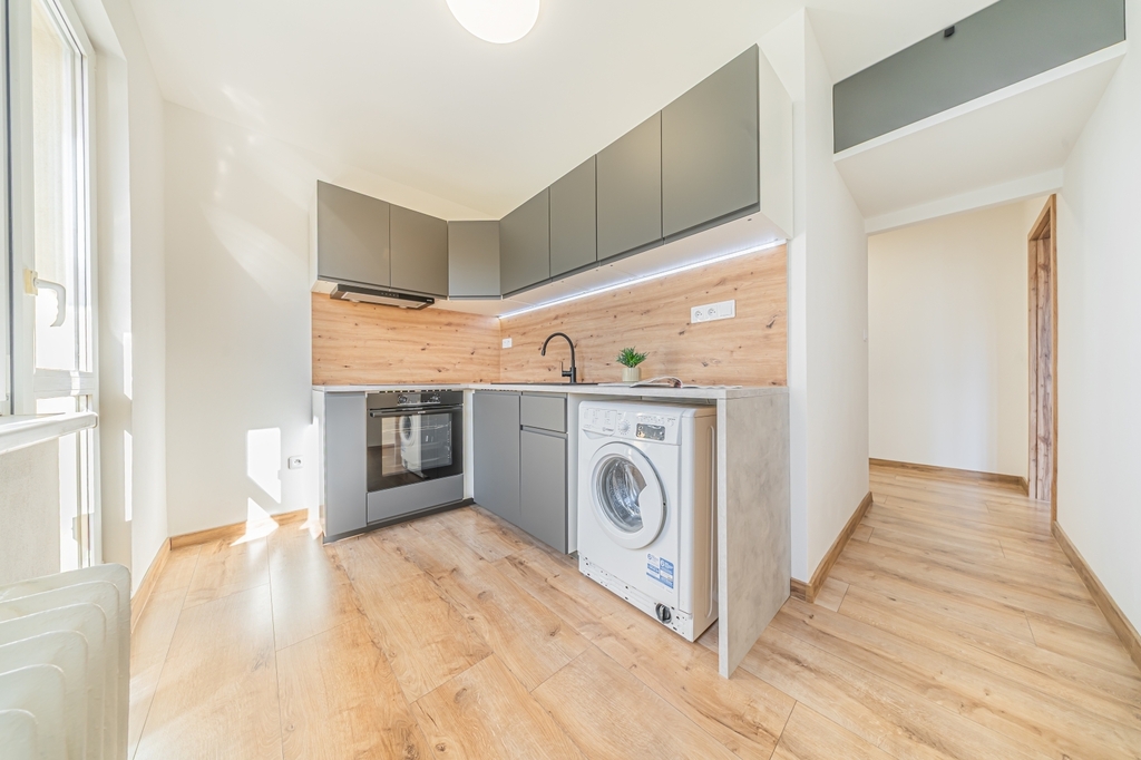 Koupelna je řešena ve vyšším standardu, disponuje sprchovým koutem s černou sprchovou baterií a designovými doplňky v černé barvě, zrcadlem s LED osvětlením, velkoformátovými obklady a závěsným WC systémem Geberit. Kuchyň je prakticky řešena, rohová linka IKEA je vybavena indukční varnou deskou, elektrickou troubou a digestoří značky Gorenje.