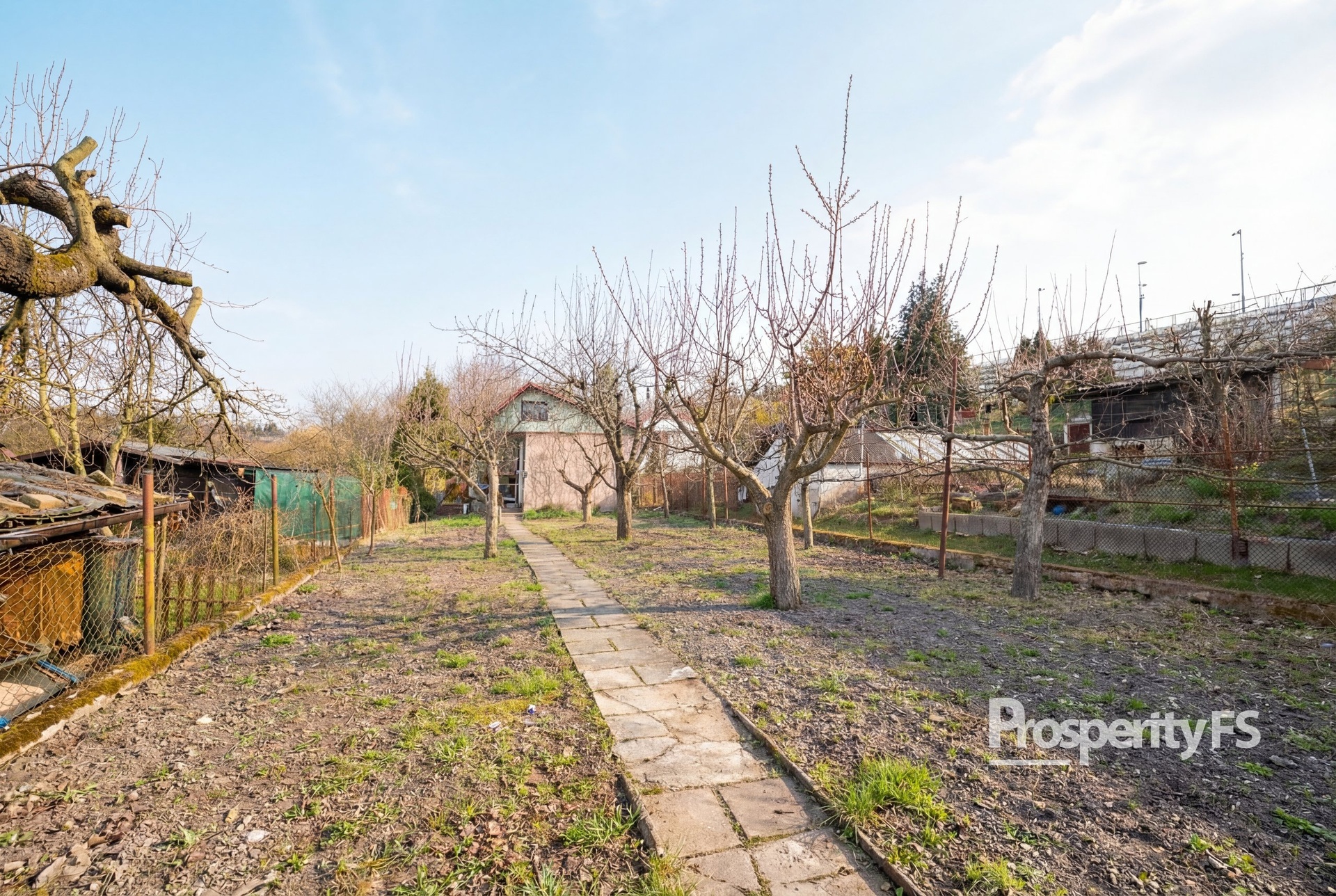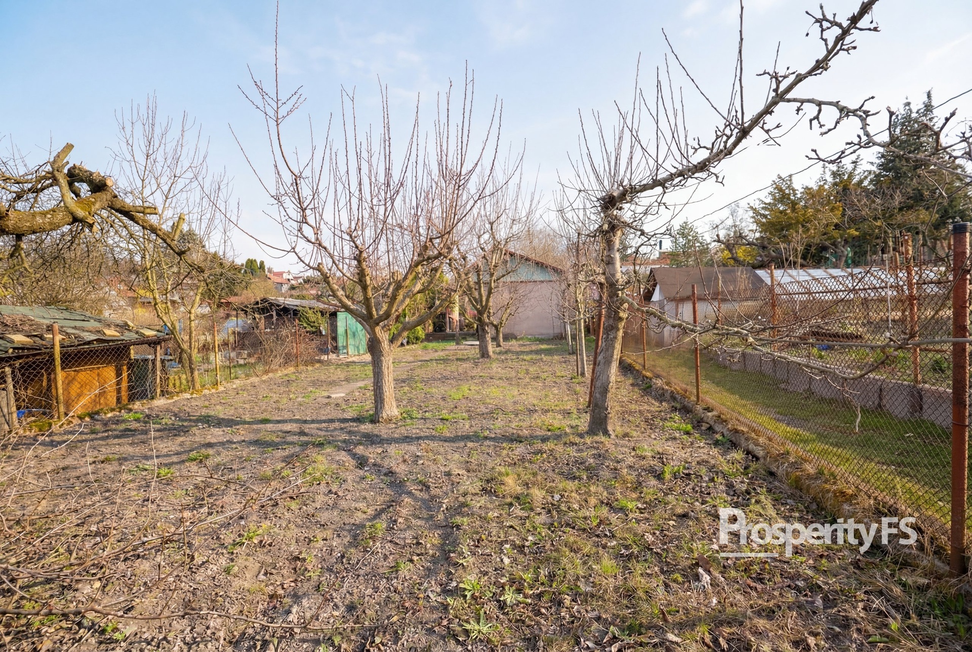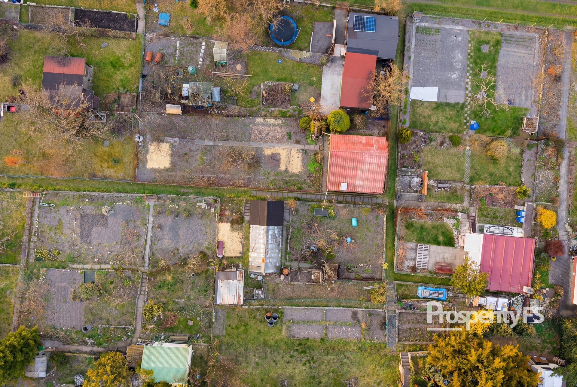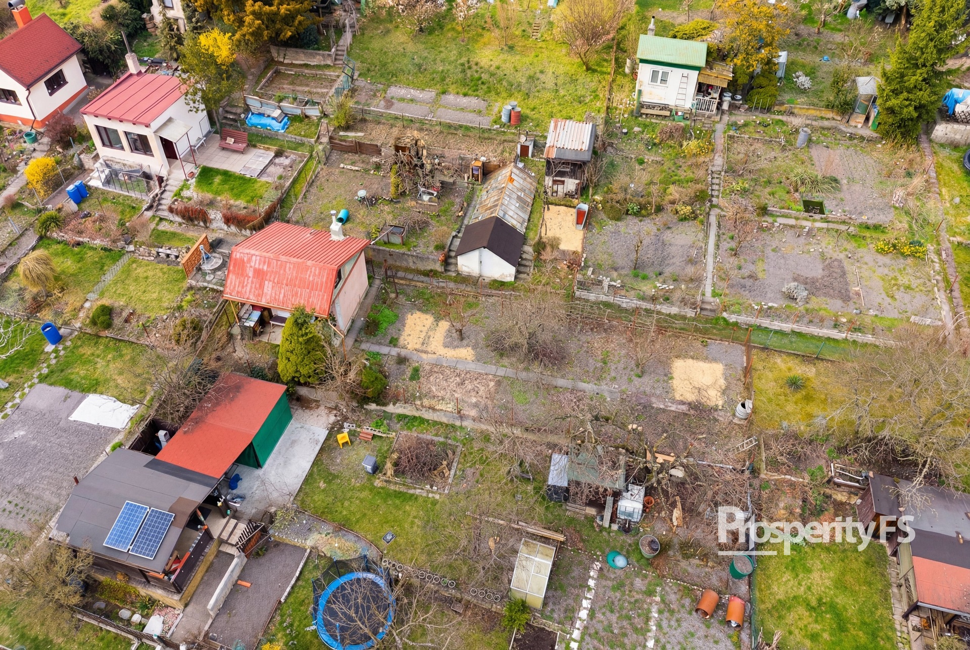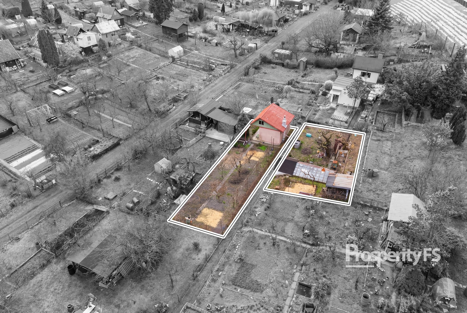 Pozemek je rozdělen na dvě části chodníkem mezi jednotlivými parcelami. První část je zastavěna chatkou a terasou, která je orientována na jižní stranu a je tak ideální na ranní kávu s výhledem do zbytku zahrádkářské kolonie. Druhá část pozemku je zastavěna skleníkem, který je uzamykatelný. Všechna ostatní půda je využívána k pěstování plodin.