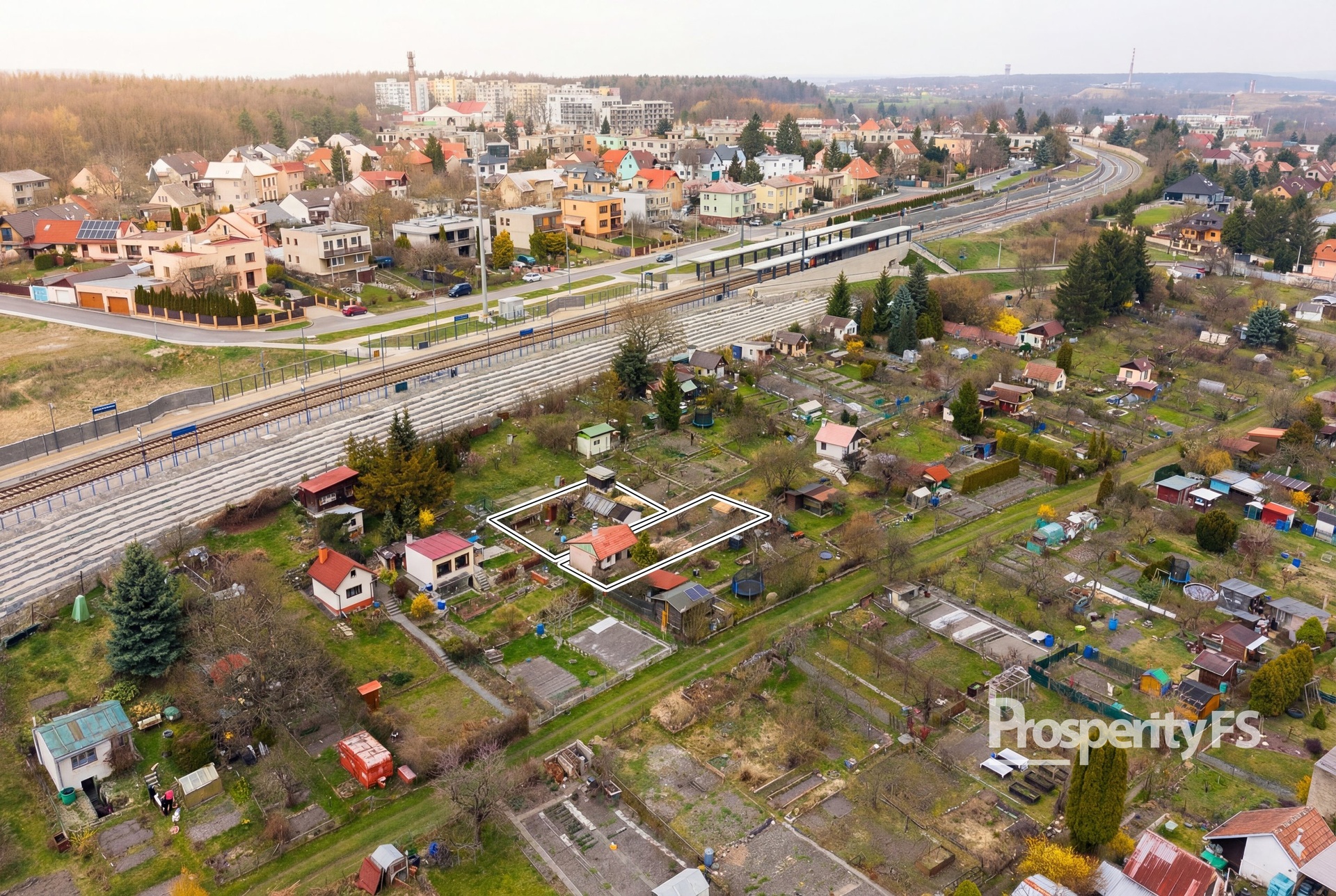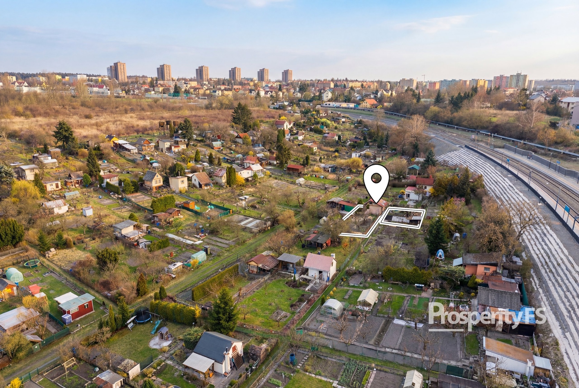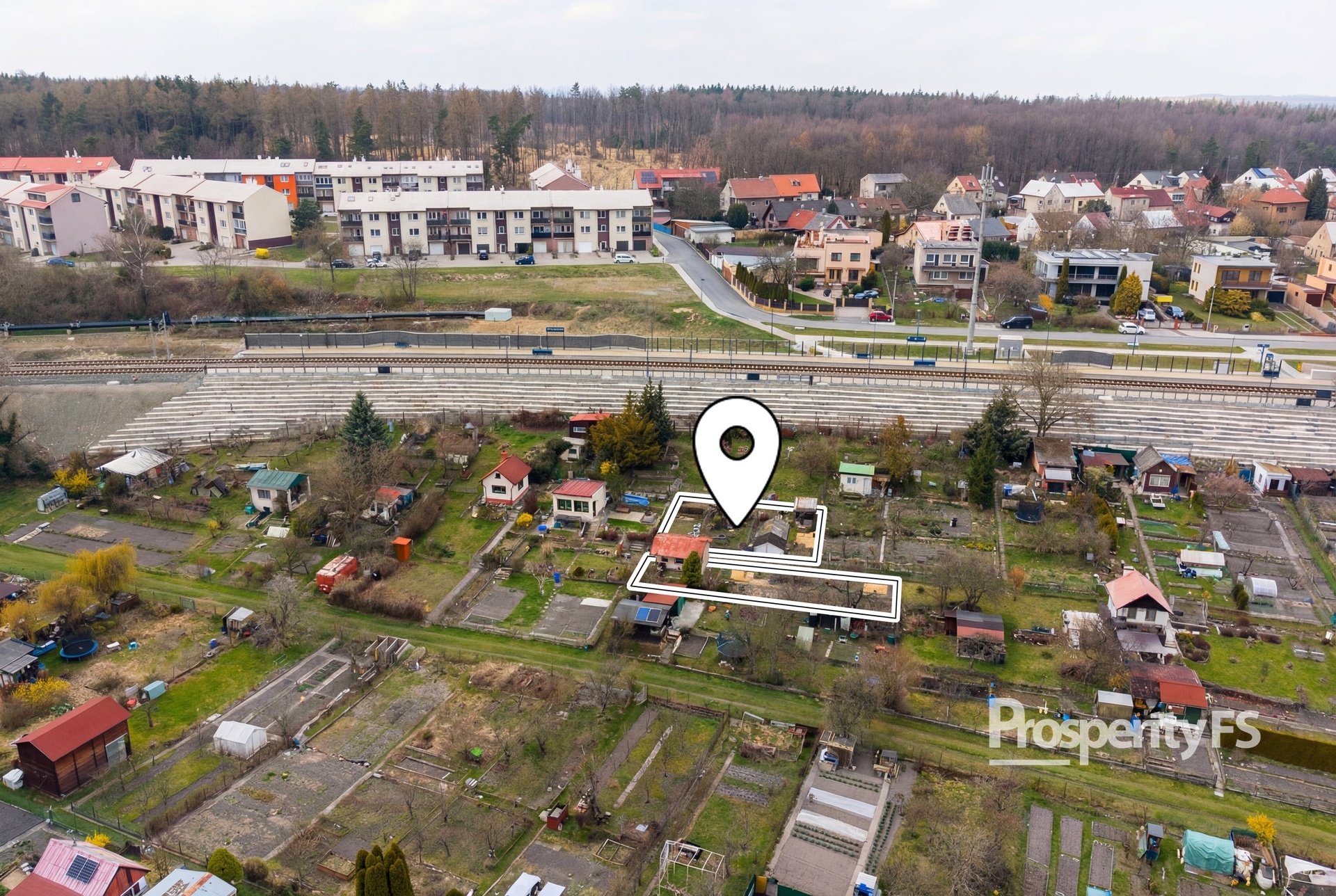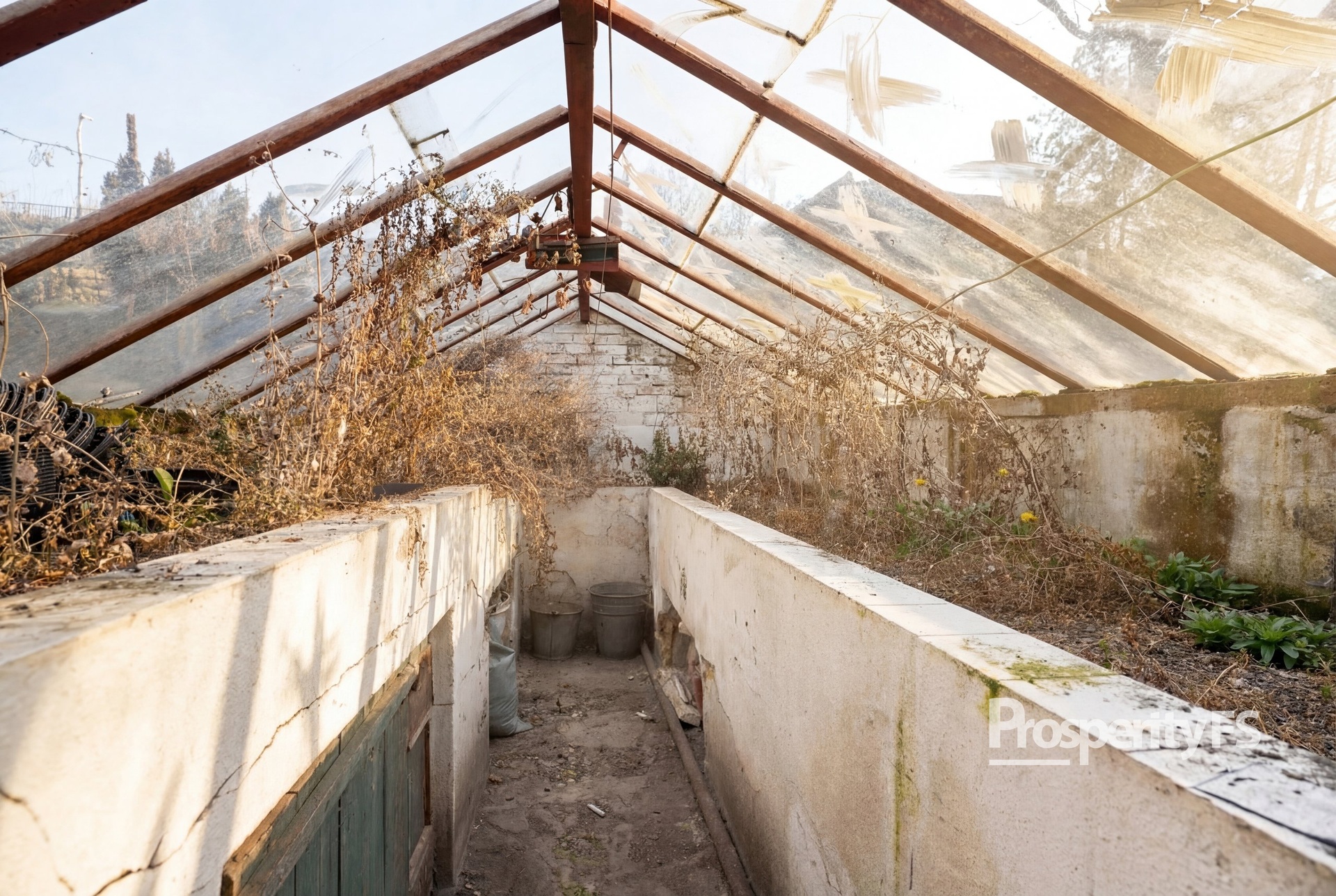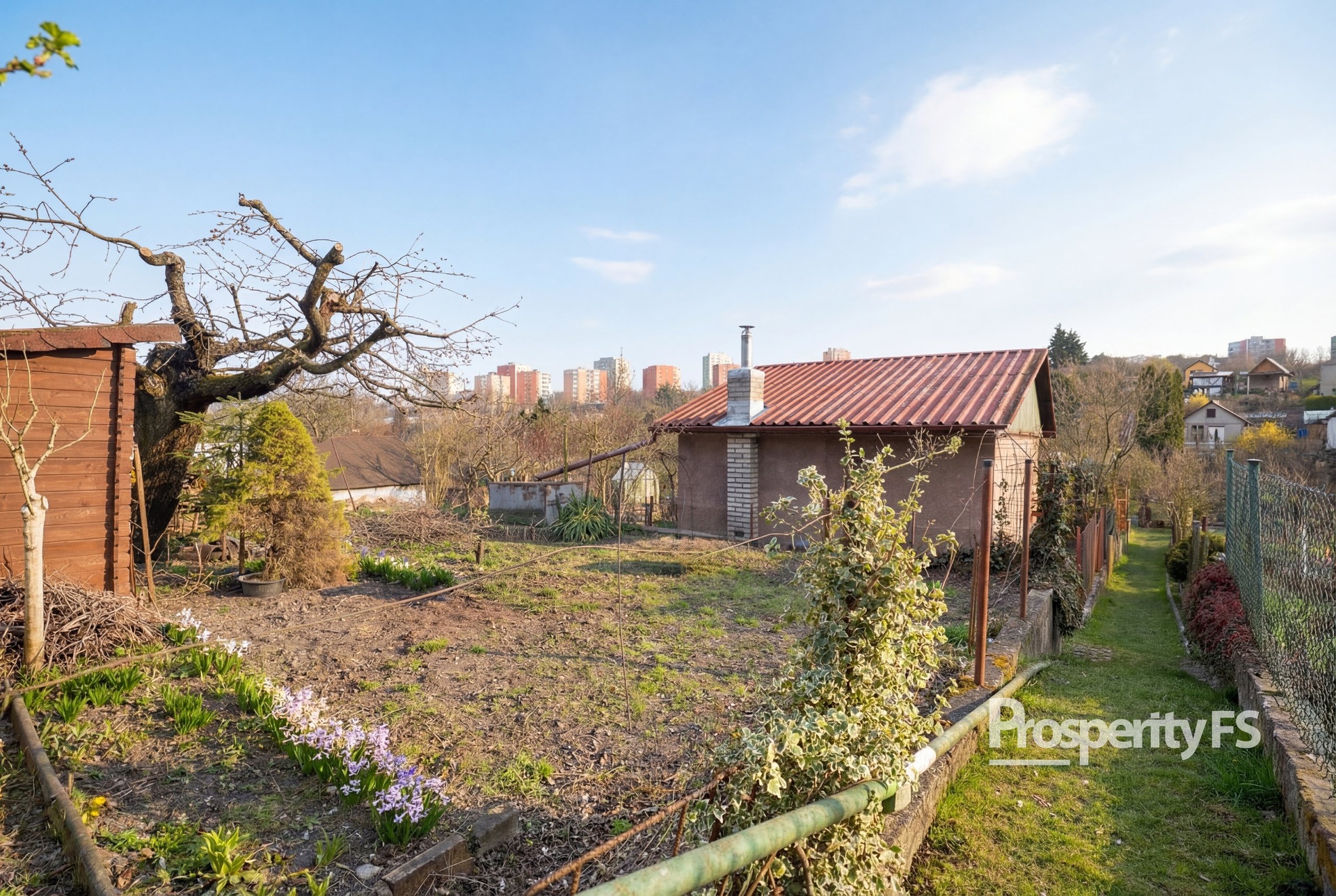 Pozemek je rozdělen na dvě části chodníkem mezi jednotlivými parcelami. První část je zastavěna chatkou a terasou, která je orientována na jižní stranu a je tak ideální na ranní kávu s výhledem do zbytku zahrádkářské kolonie. Druhá část pozemku je zastavěna skleníkem, který je uzamykatelný. Všechna ostatní půda je využívána k pěstování plodin.