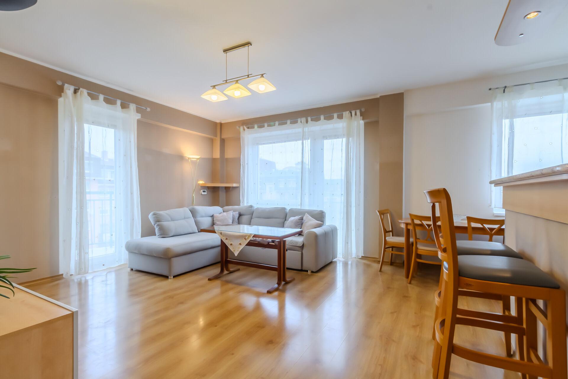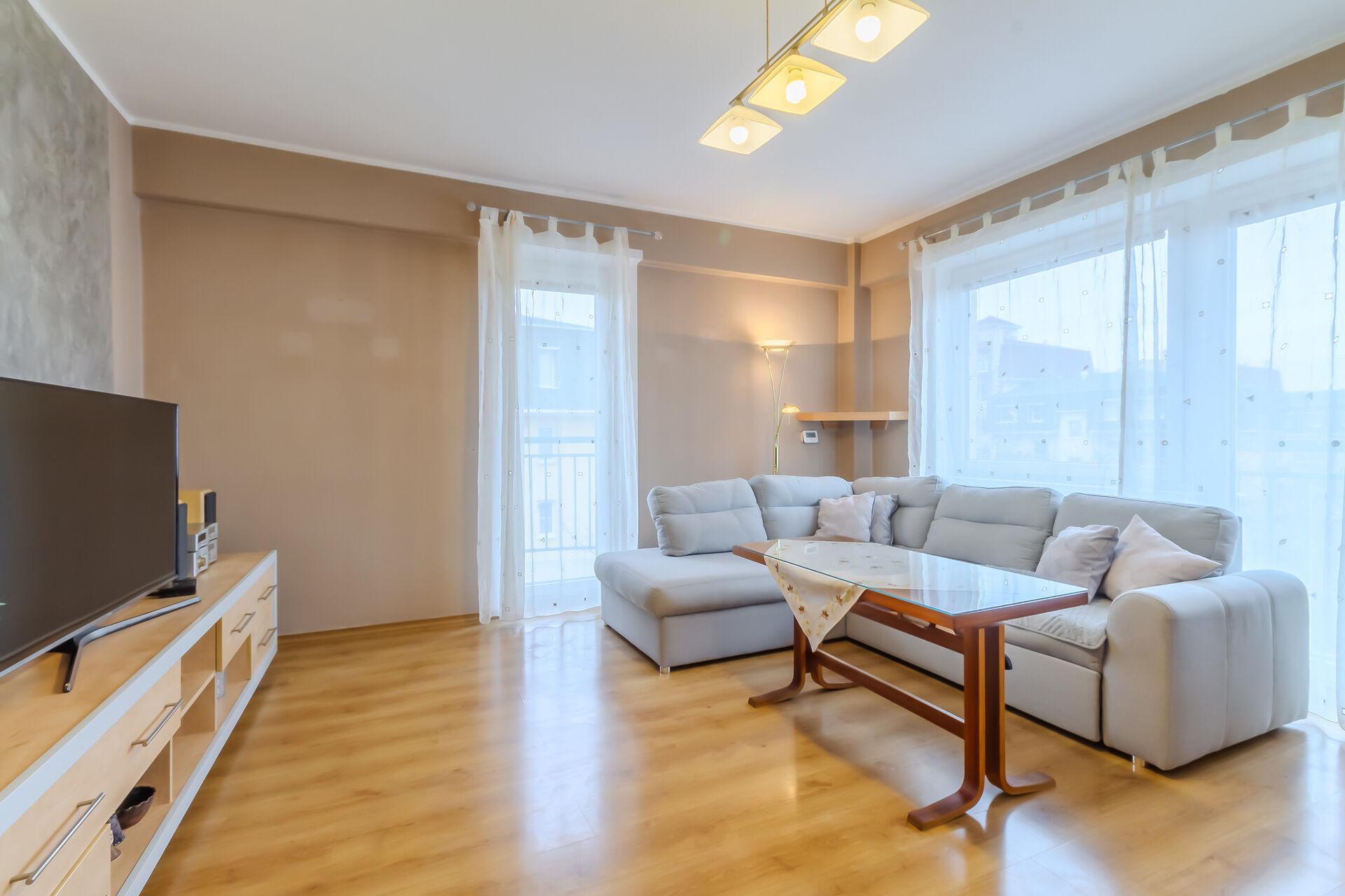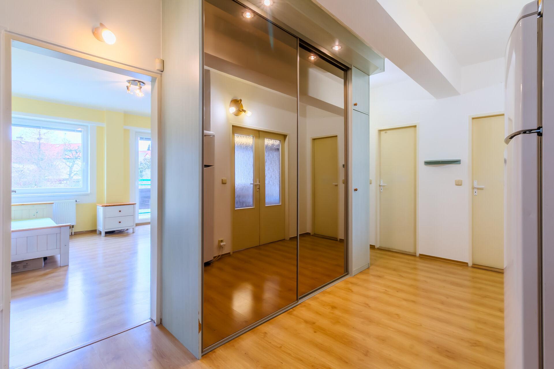 Srdcem bytu je obývací pokoj s kuchyňským koutem o ploše 32 m², který působí vzdušně a přirozeně propojuje společenskou část bytu. Bez problémů zde vytvoříte plnohodnotnou jídelnu i pohodlný obývací prostor. Velká okna zajišťují dostatek denního světla a přímý vstup na balkon (2,6 m²) nabízí příjemné místo pro relaxaci.