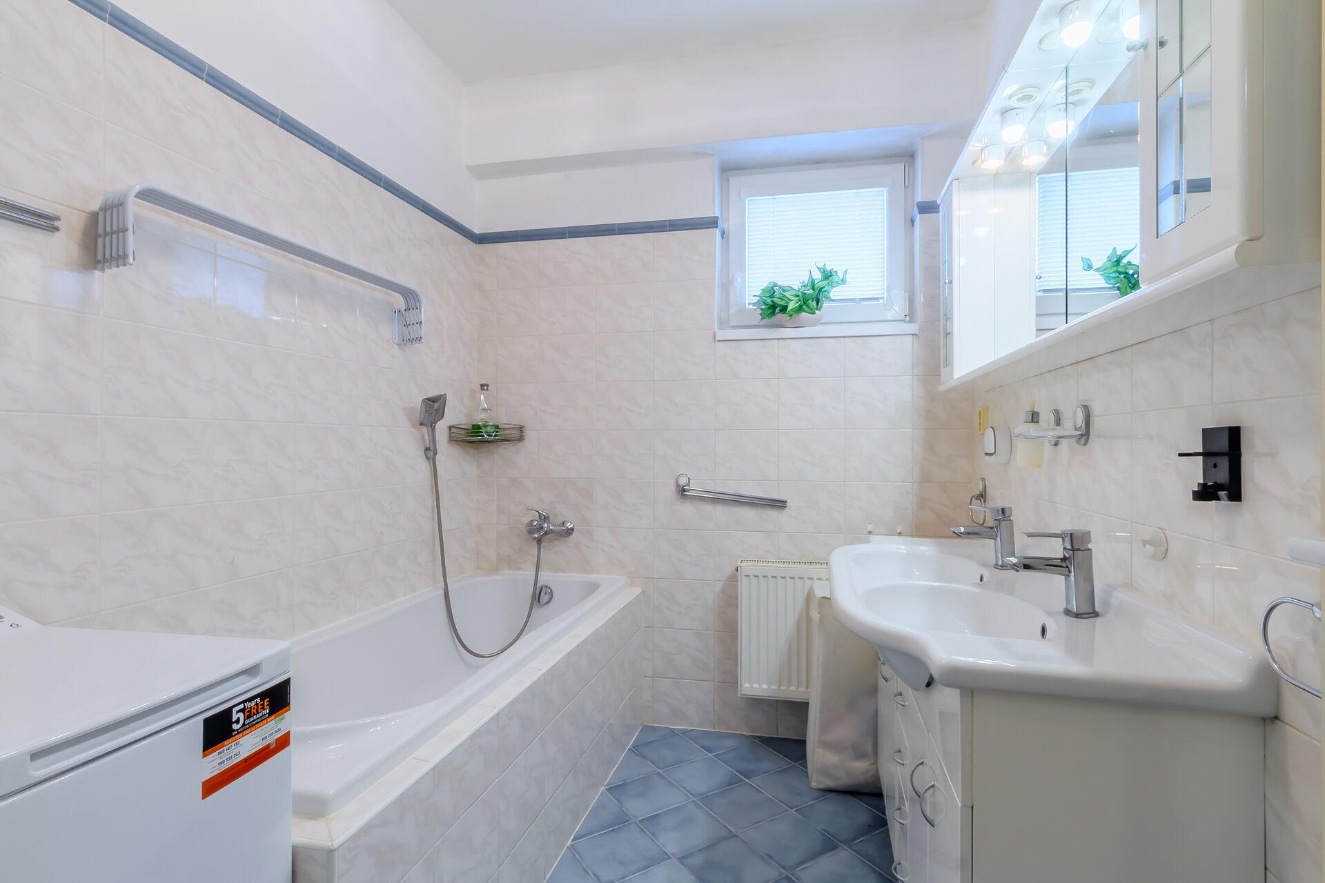 Velkým benefitem jsou dvě koupelny (5,0 m² a 2,8 m²), které umožňují komfortní fungování vícečlenné domácnosti – jednu lze využít jako hlavní rodinnou koupelnu a druhou například jako zázemí pro hosty nebo druhou generaci. Samozřejmostí je také samostatné WC (2,2 m²).