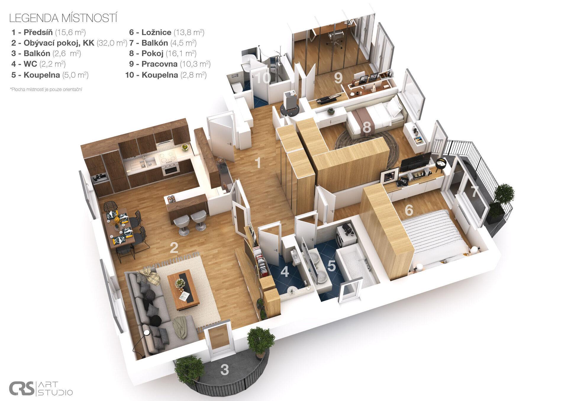 Celková dispozice je velmi promyšlená – byt působí vzdušně, logicky navazuje a nabízí dostatek úložných prostor i soukromí.