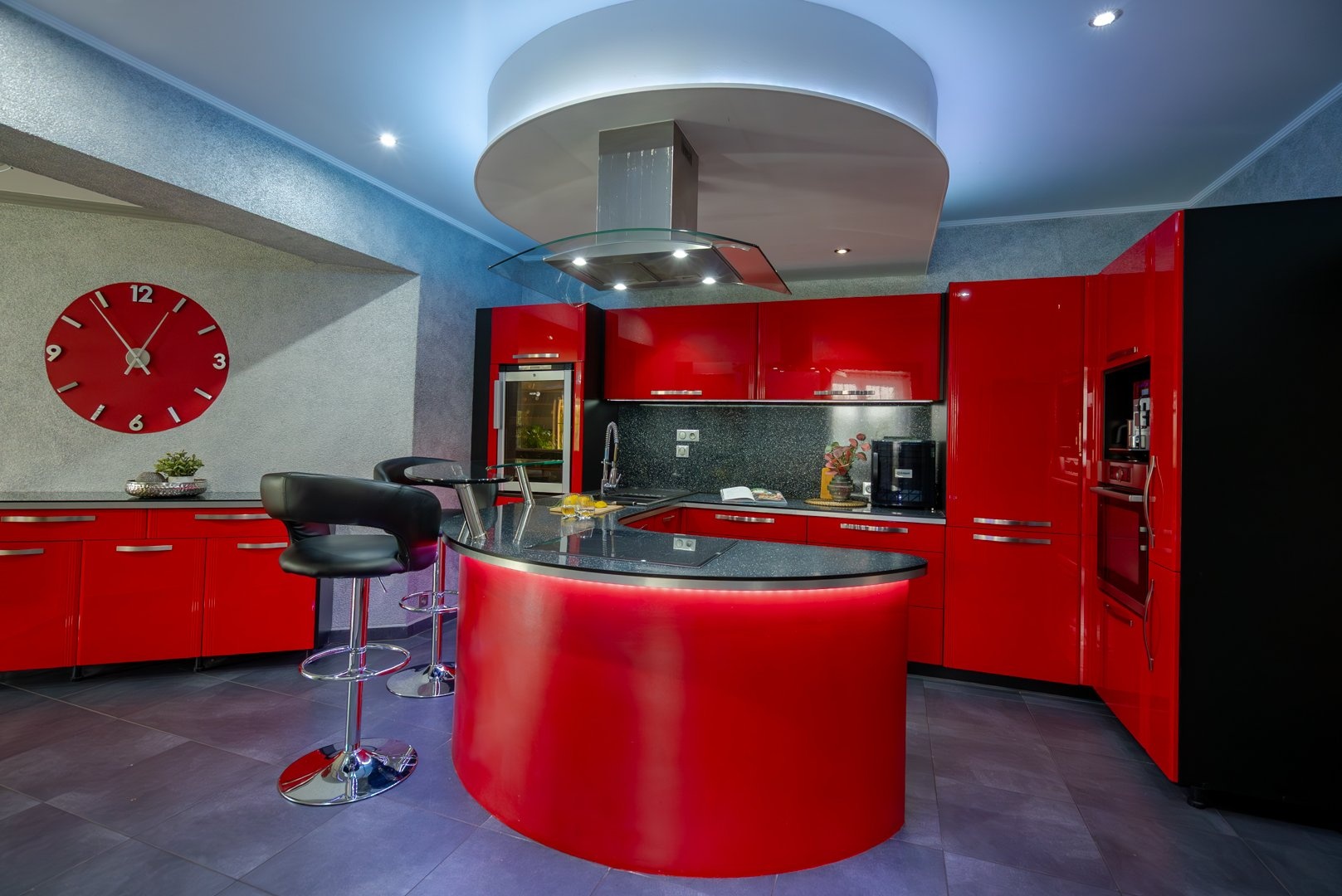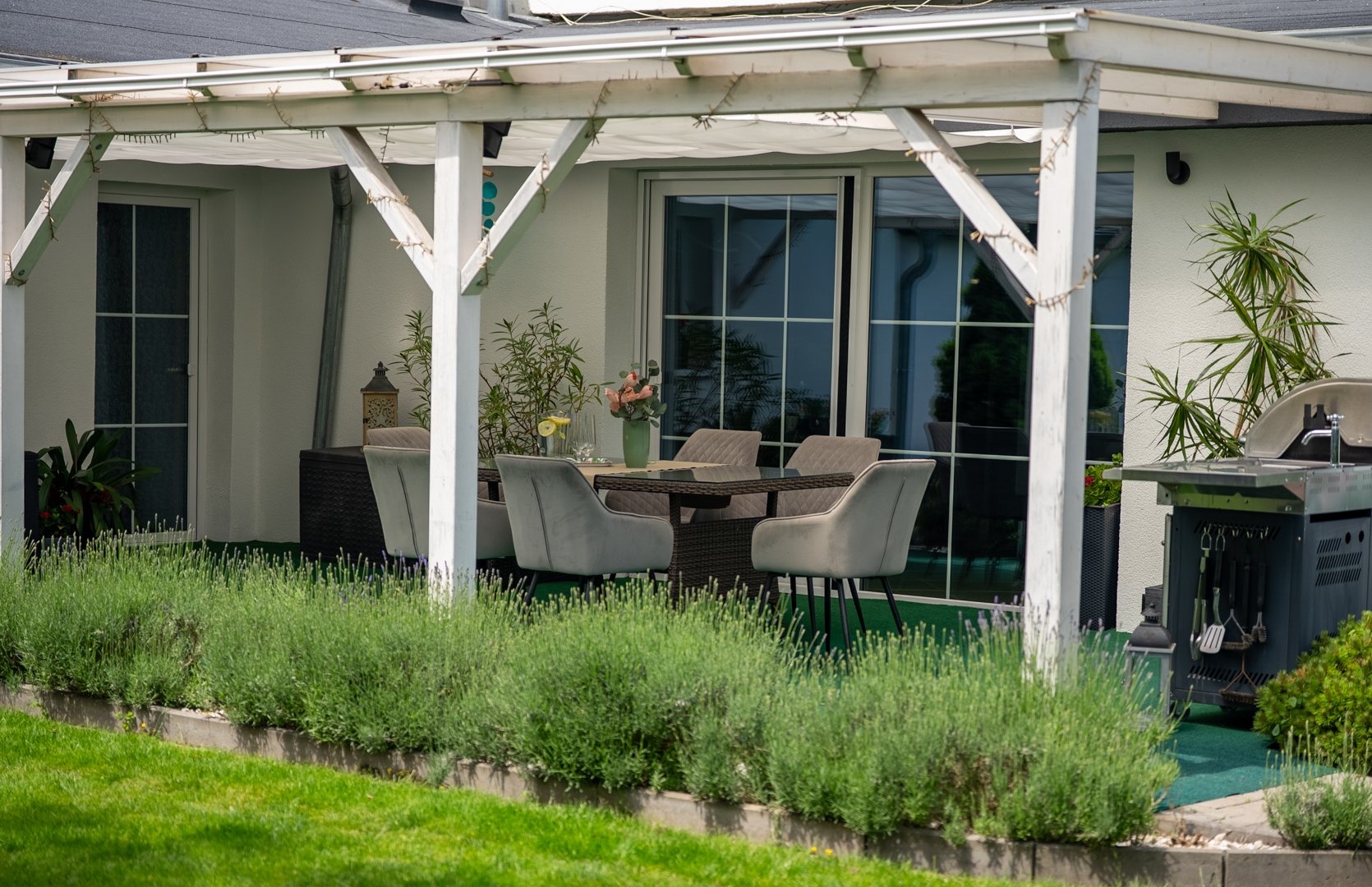 Za domem vznikla citlivě řešená přístavba, jejímž srdcem je velký obývací pokoj s krbovou vložkou (30 kW) – místo pro rodinná setkání, které volně přecházíte francouzským oknem na zastřešenou terasu a zahradu. Z otevřené kuchyně s výrazným červeným jádrem máte neustálý přehled o dění venku – třeba o tom, jak si děti hrají v zahradním domku.