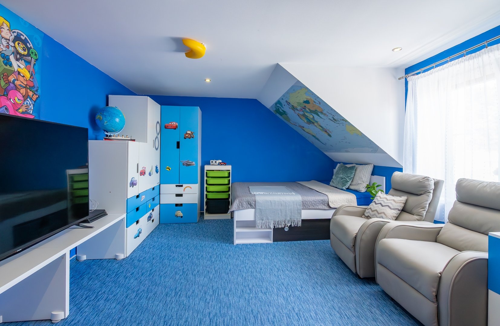 Přízemí a první patro odděluje vstupní hala a dům tak lze snadno předělat na dvougenerační bydlení. V jednom z horních pokojů jsou připraveny přípojky na vodu a odpad - to kdybyste zatoužili po druhé kuchyni. V současnosti jsou v prvním patře dva dětské pokoje a světlá koupelna s WC.