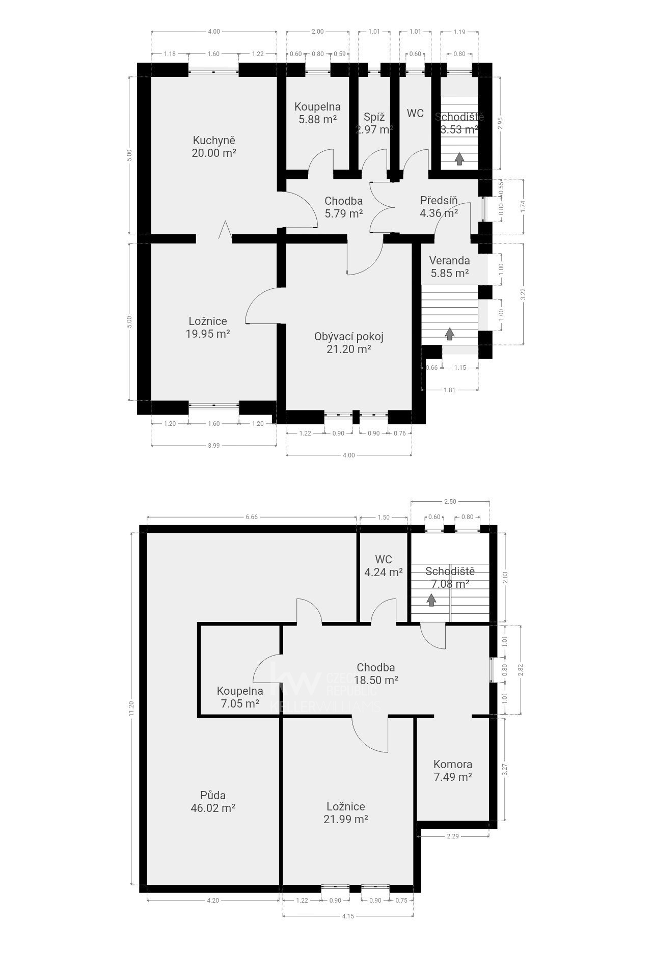 Patro (59 m²): ložnice, koupelna, WC, chodba + půda 46 m² vhodná pro vestavbu dalších pokojů