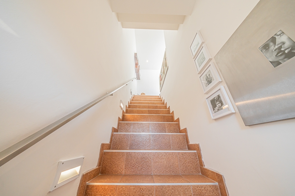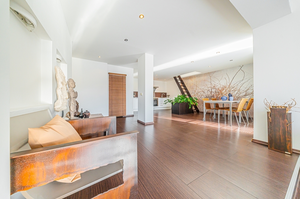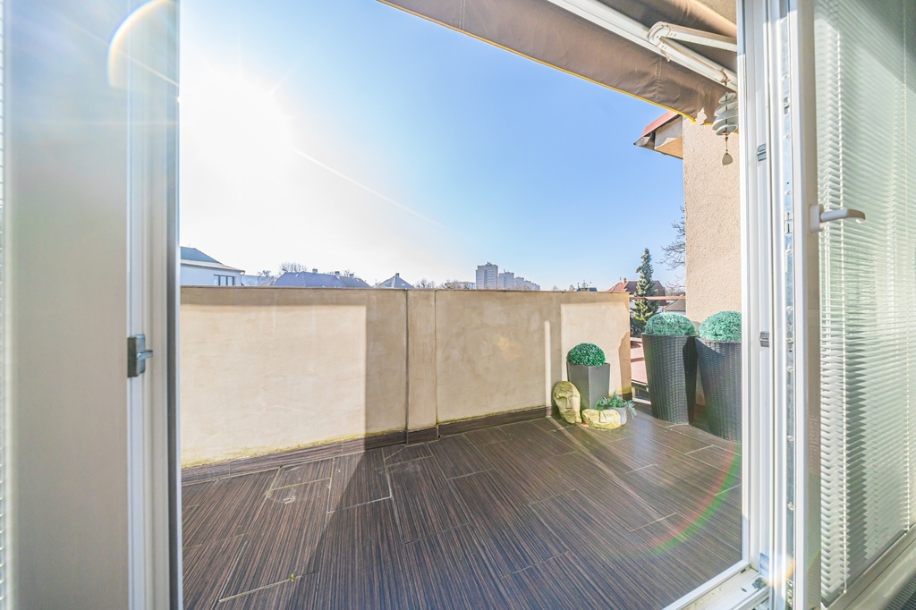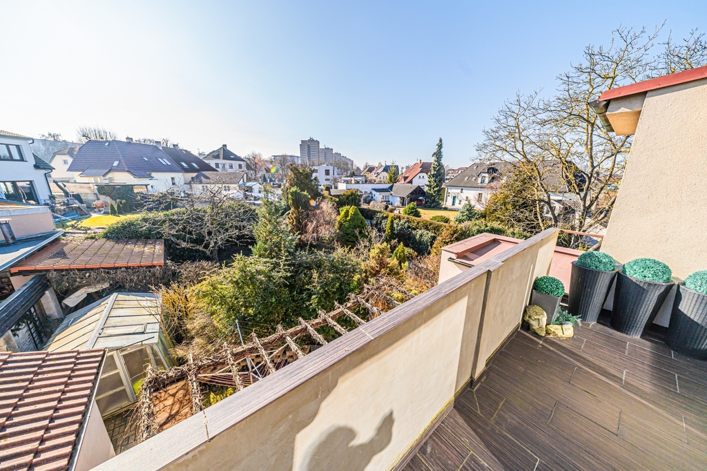 Horní podlaží prošlo kompletní moderní rekonstrukcí a nabízí vysoký standard bydlení. Nachází se zde obývací pokoj s velkým francouzským oknem se vstupem na terasu. Její orientace je jihozápadní a je vybavena zatahovací markýzou. Další obytný prostor je řešen jako otevřený celek propojující obývací část s kuchyňským koutem a jídelnou. K dispozici je ložnice s navazující šatnou, koupelna s WC, praktický kumbál a schodiště do podkroví, kde se nachází další ložnice. Vytápění a ohřev teplé vody zajišťuje plynový kotel Dakon se zásobníkem, v celém podlaží, kromě ložnice je podlahové vytápění řízené termostatem. Toaleta je řešena závěsným systémem Geberit. Interiér doplňují sádrokartonové podhledy a moderní kuchyňská linka se sklokeramickou deskou Schott Ceran, troubou Whirlpool a digestoří.
