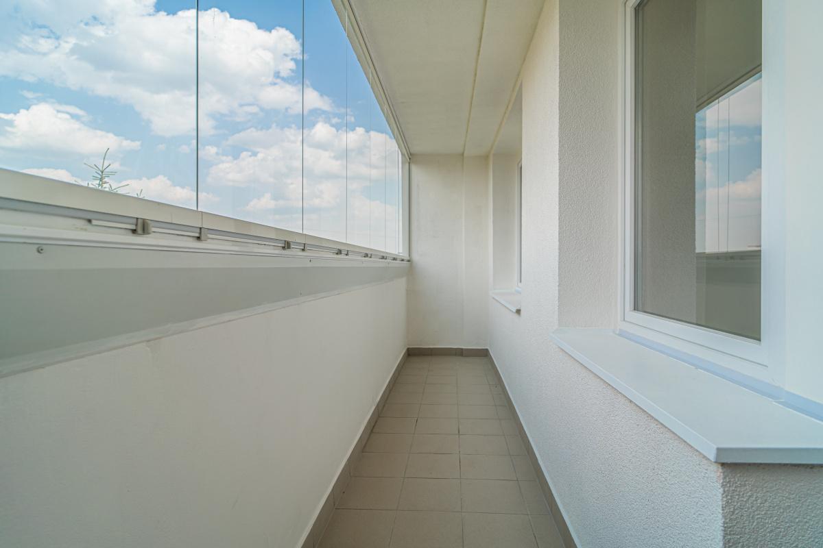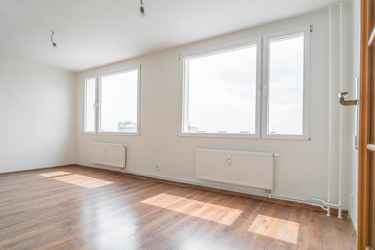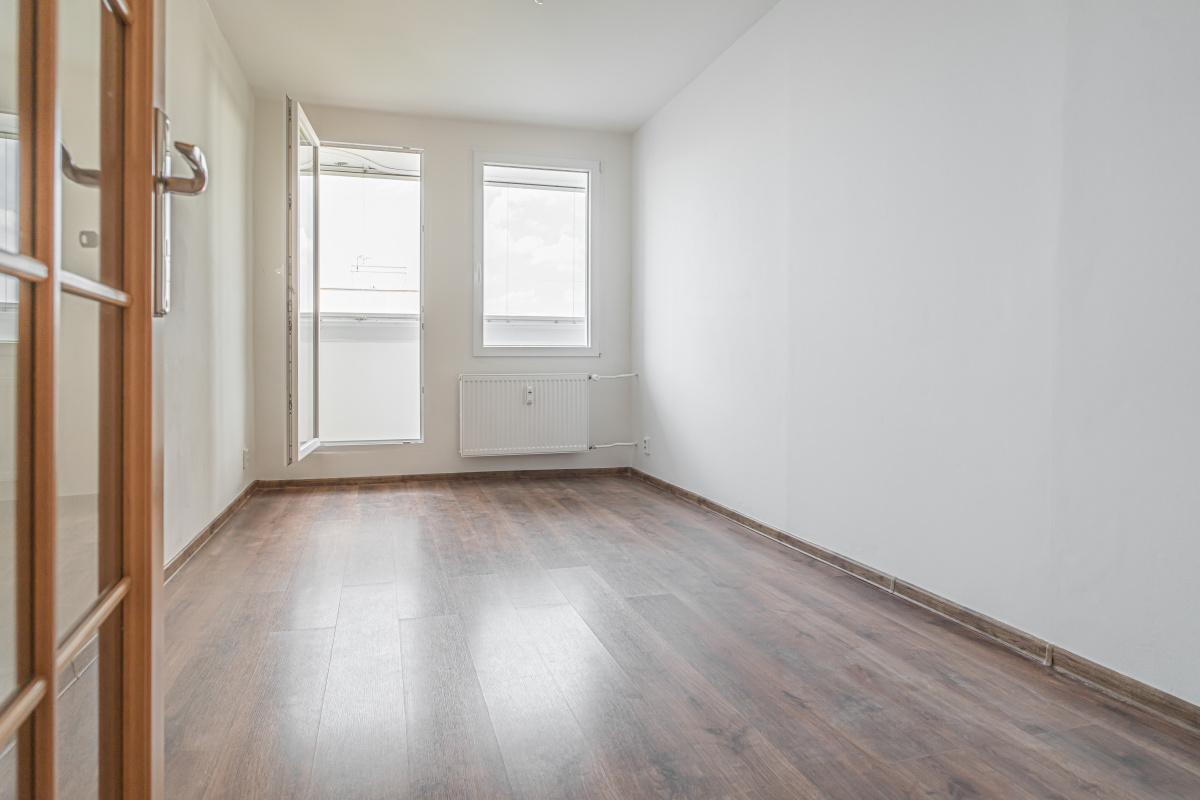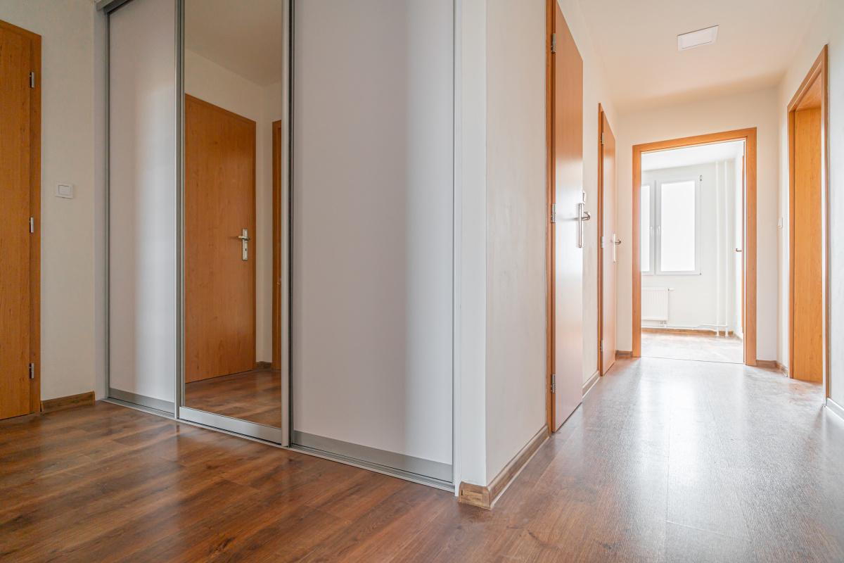 Dispozičně je byt řešen jako vstupní chodba, obývací pokoj s kuchyňským koutem, tři samostatné pokoje, koupelna, oddělené WC, technická místnost a lodžie. K bytu náleží také sklepní kóje.