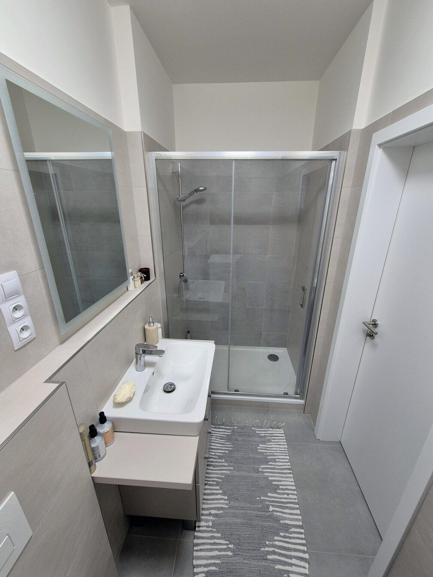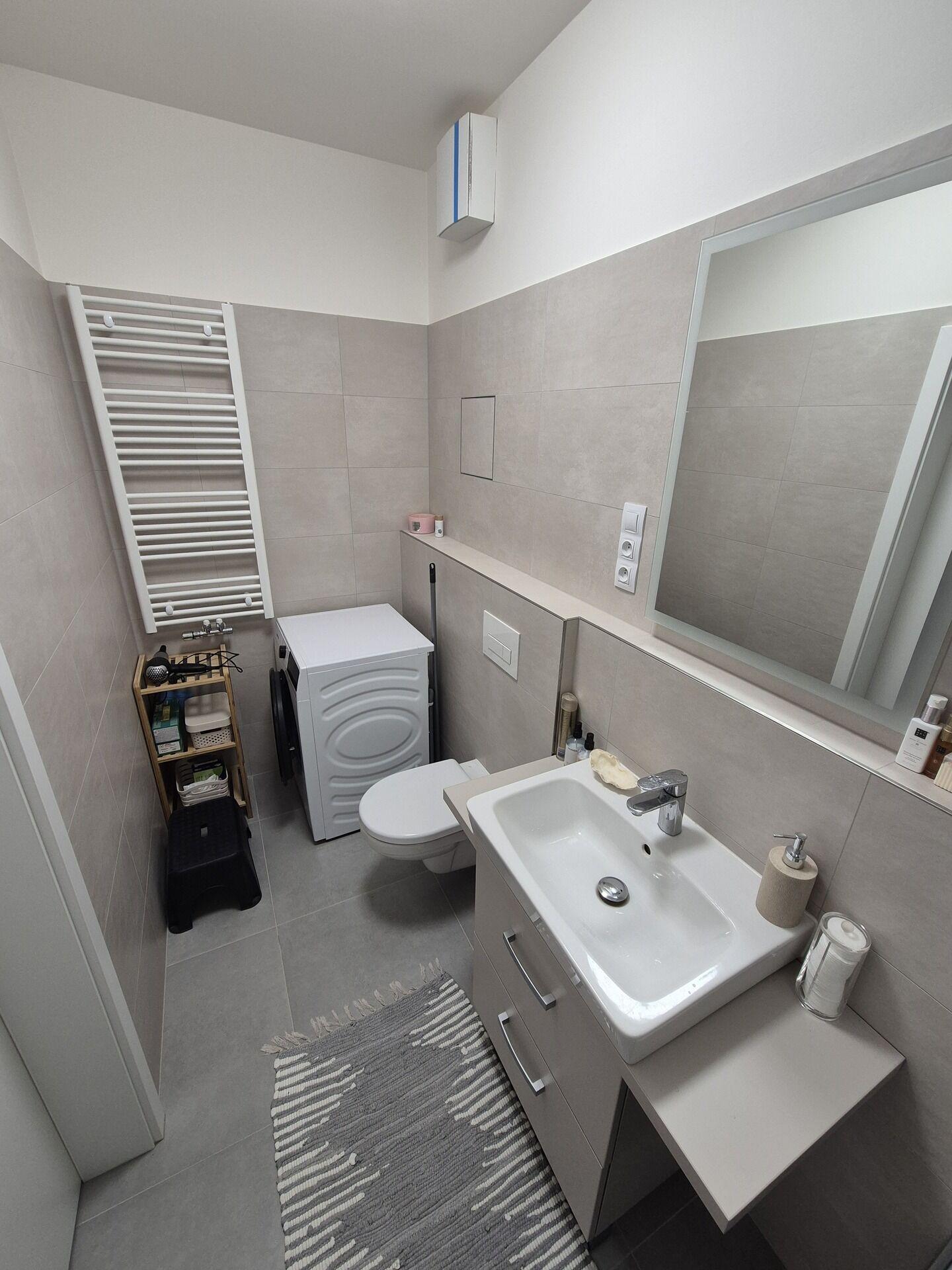 Koupelna: Sprchový kout, umyvadlo se skříňkou, pračka a toaleta.