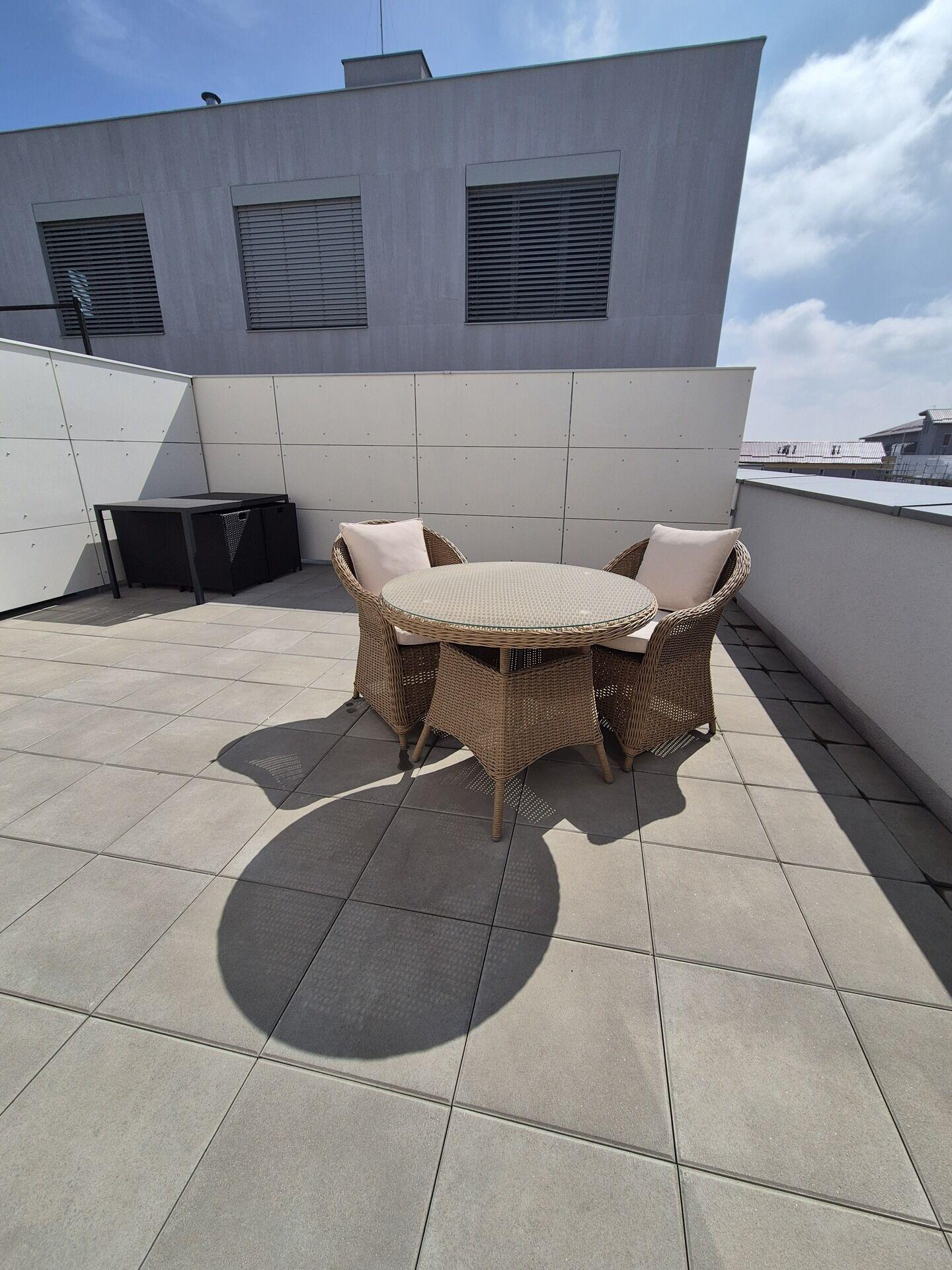 Terasa: Z obývacího pokoje je vstup na prostornou terasu s ratanovým nábytkem, která nabízí skvělý prostor pro relaxaci.