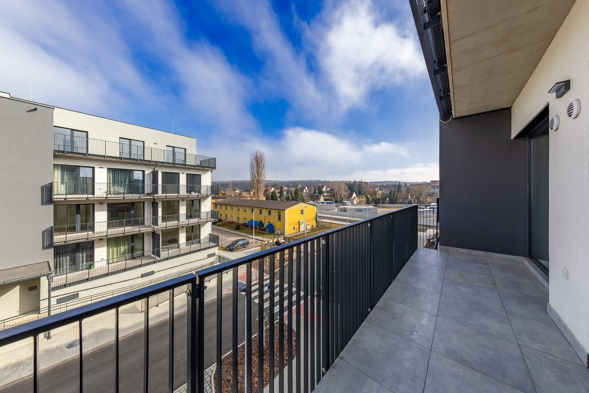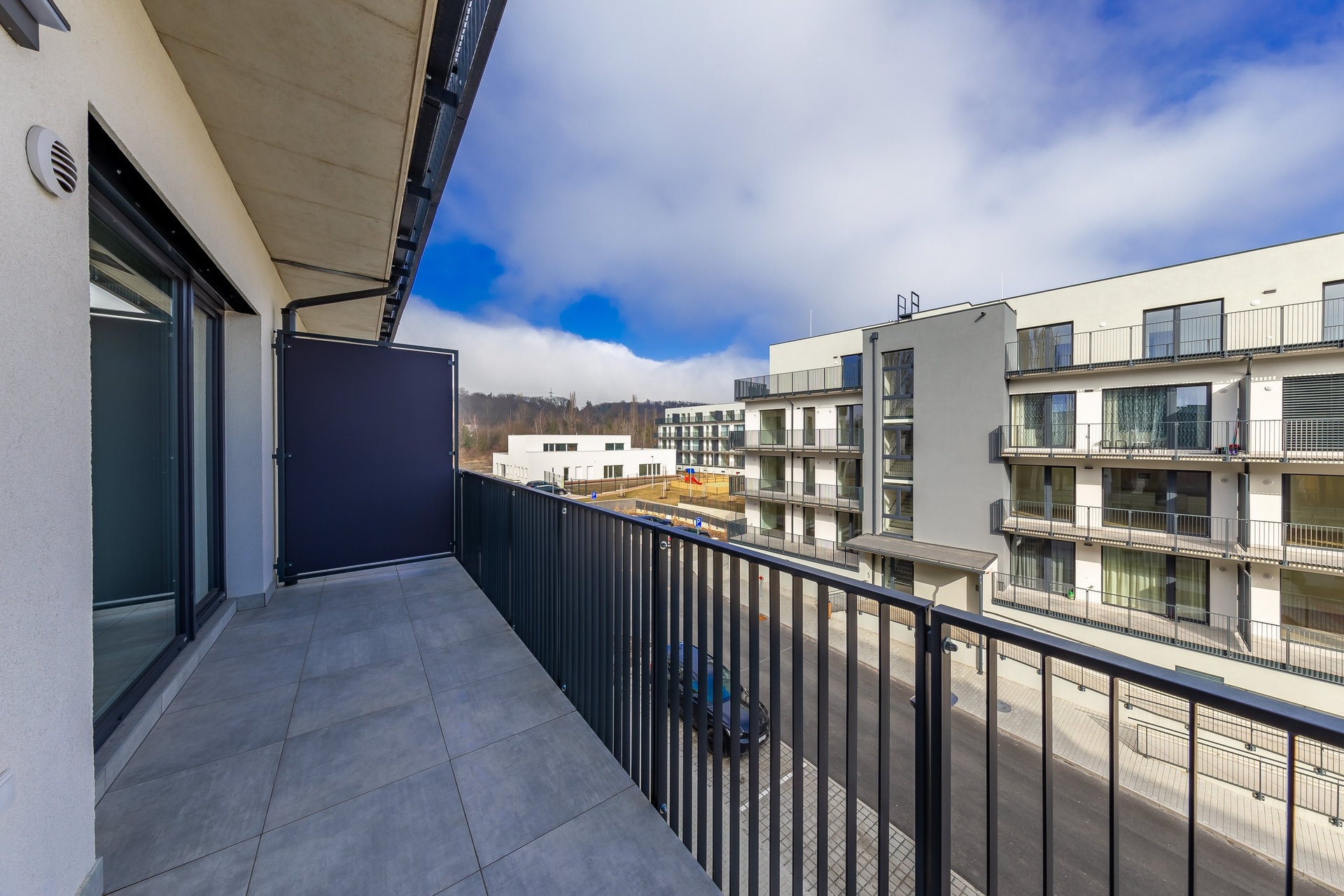 Byt je orientován na východ a disponuje prostorným balkonem se vstupem z obývacího pokoje i ložnice, což zajišťuje dostatek ranního světla a příjemnou atmosféru.